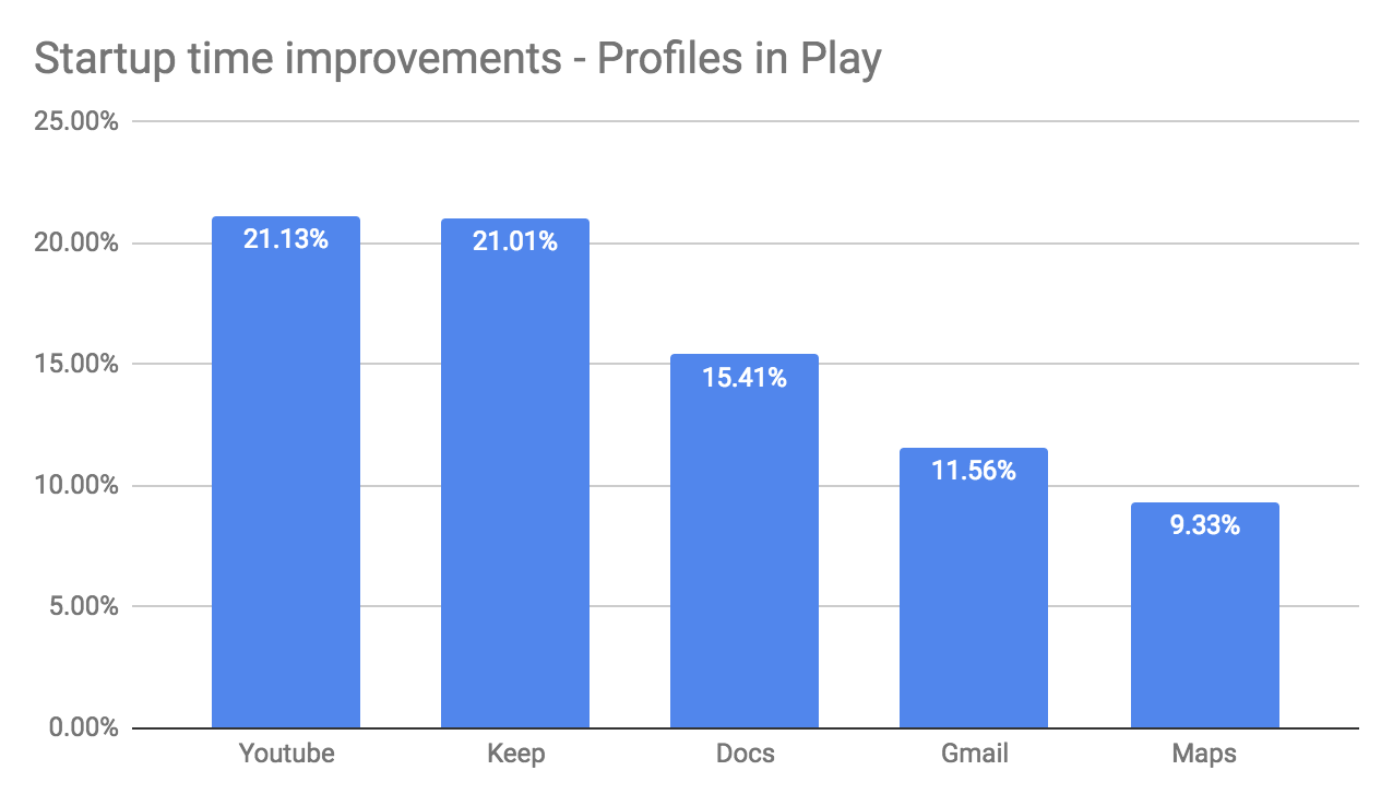 แผนภูมินี้แสดงเปอร์เซ็นต์ การปรับปรุงเวลาเริ่มต้นของแอปที่เฉพาะเจาะจงเมื่อทดสอบ โดยใช้โปรไฟล์ Play