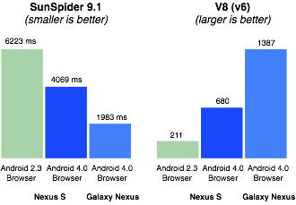 Across all types of content, the Android Browser offers dramatically improved page rendering performance through updated versions of the WebKit core and the V8 Crankshaft compilation engine for JavaScript. In benchmarks run on a Nexus S device, the Android 4.0 browser showed an improvement of nearly 220% over the Android 2.3 browser in the V8 Benchmark Suite and more than 35% in the SunSpider 9.1 JavaScript Benchmark. When run on a Galaxy Nexus device, the Android 4.0 browser showed improvement of nearly 550% in the V8 benchmark and nearly 70% in the SunSpider benchmark.