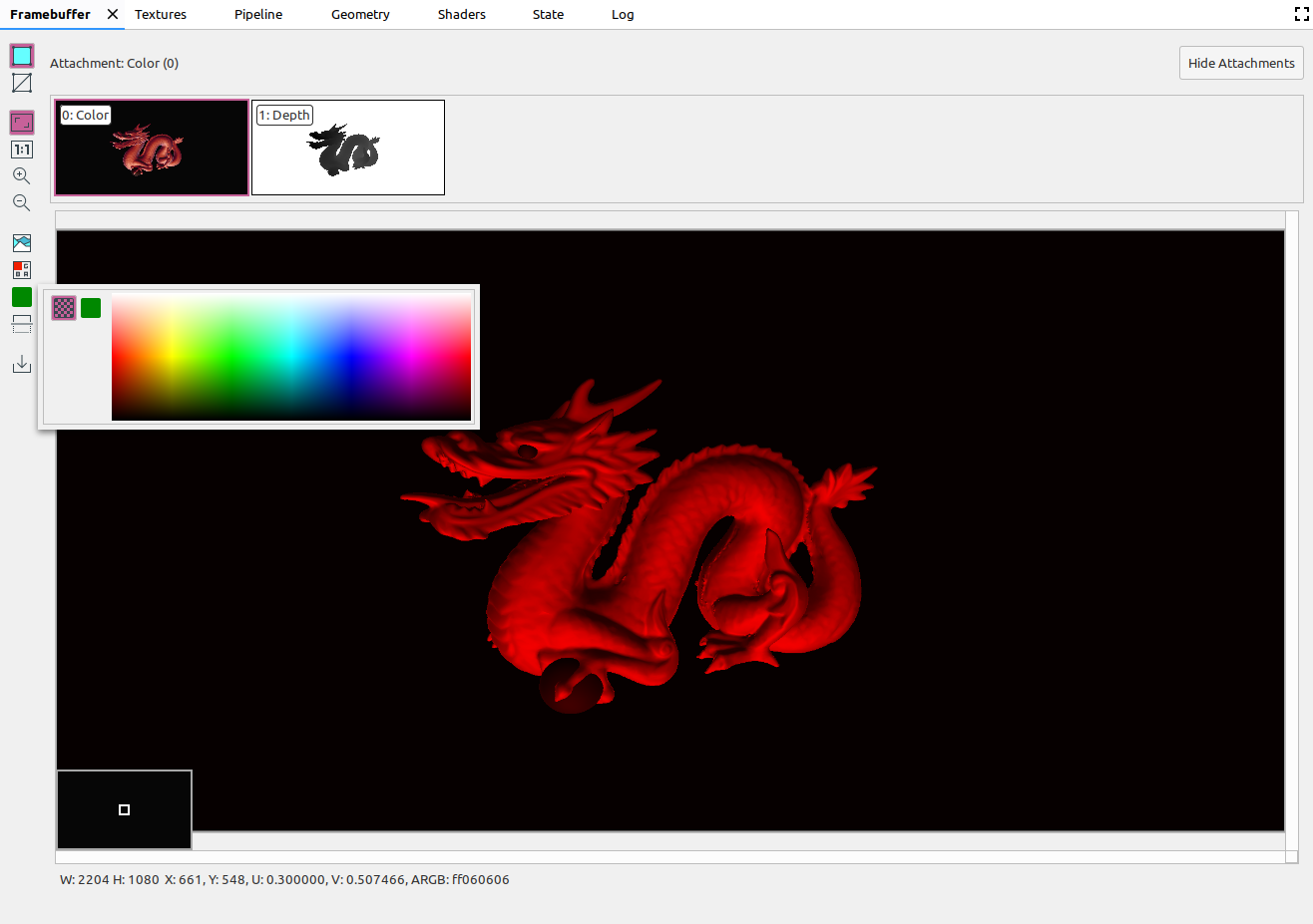 A framebuffer can contain multiple attachments. You can select which attachment to display and click Show Attachments or Hide Attachments as needed. Attachment thumbnails are labeled with the type of the attachment (for example, COLOR, DEPTH, and INPUT) as well as its index.