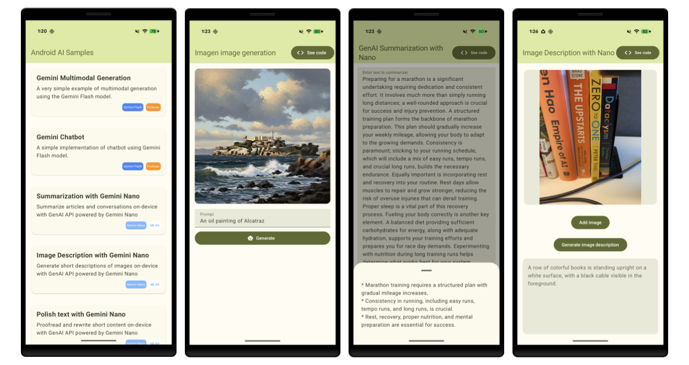 Android AI 샘플 카탈로그는 Google의 AI 모델로 활용할 수 있는 생성형 AI 기능의 가능성을 보여주는 개별적인 독립형 샘플에 액세스할 수 있는 독립형 애플리케이션입니다.