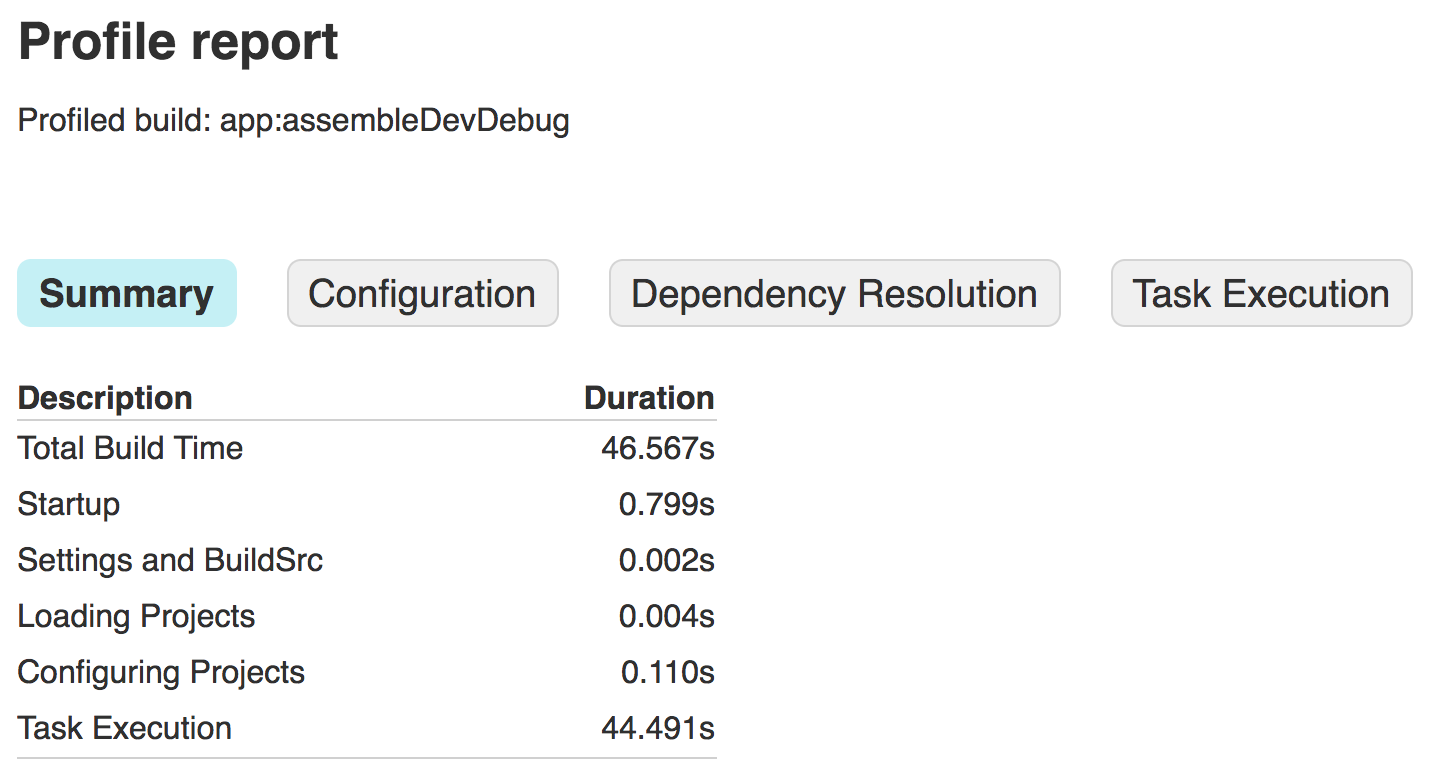 Larger projects, or those that implement a lot of custom build logic, may require you to take a deeper look into the build process to find bottlenecks. You can do that by profiling how long Gradle takes to execute each phase of the build lifecycle and each build task. For example, if your build profile shows that Gradle is spending too much time configuring your project, it may suggest that you need to move custom build logic out of the configuration phase. Additionally, if the mergeDevDebugResources task consumes a large amount of the build time, it may indicate that you need to either convert your images to WebP or disable PNG crunching.