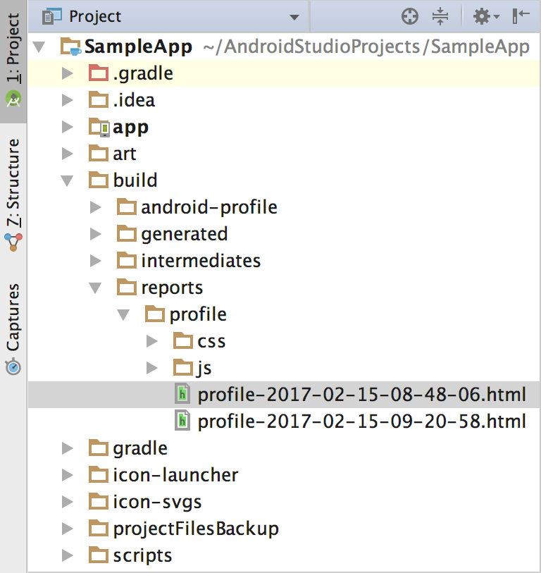 After the build completes, use the Project window navigate to the project-root/build/reports/profile/ directory (as shown in figure 1).