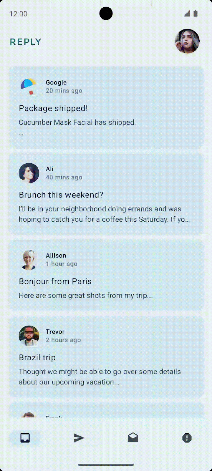 Como se mencionó con anterioridad, este elemento de navegación no es ideal, ya que los usuarios pueden tener dificultades a la hora de acceder a estos elementos esenciales de navegación en pantallas más grandes. Afortunadamente, existen patrones recomendados para diferentes elementos de este tipo en varias clases de tamaño de ventana de navegación para IU responsivas. En la app de Reply, puedes implementar los siguientes elementos: