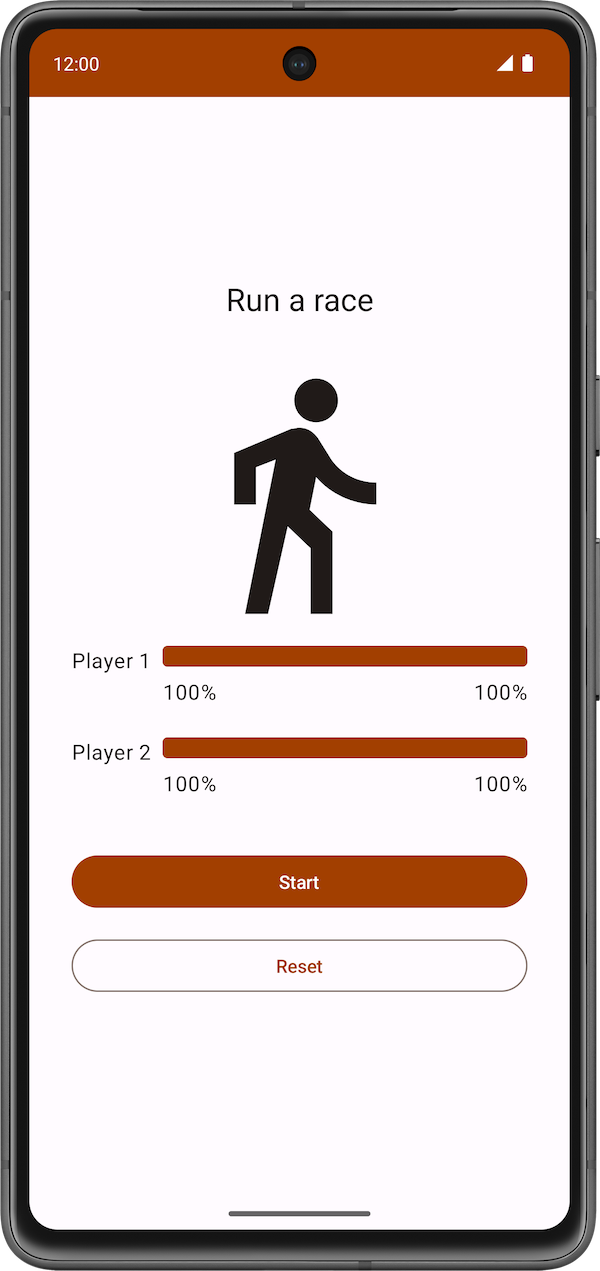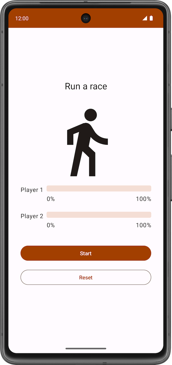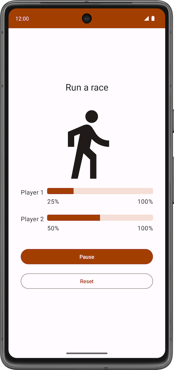 The Race Tracker app simulates two players running a race. The app UI consists of two buttons, Start/Pause and Reset, and two progress bars to show the progress of the racers. Players 1 and 2 are set to "run" the race at different speeds. When the race starts Player 2 progresses twice as fast as Player 1.