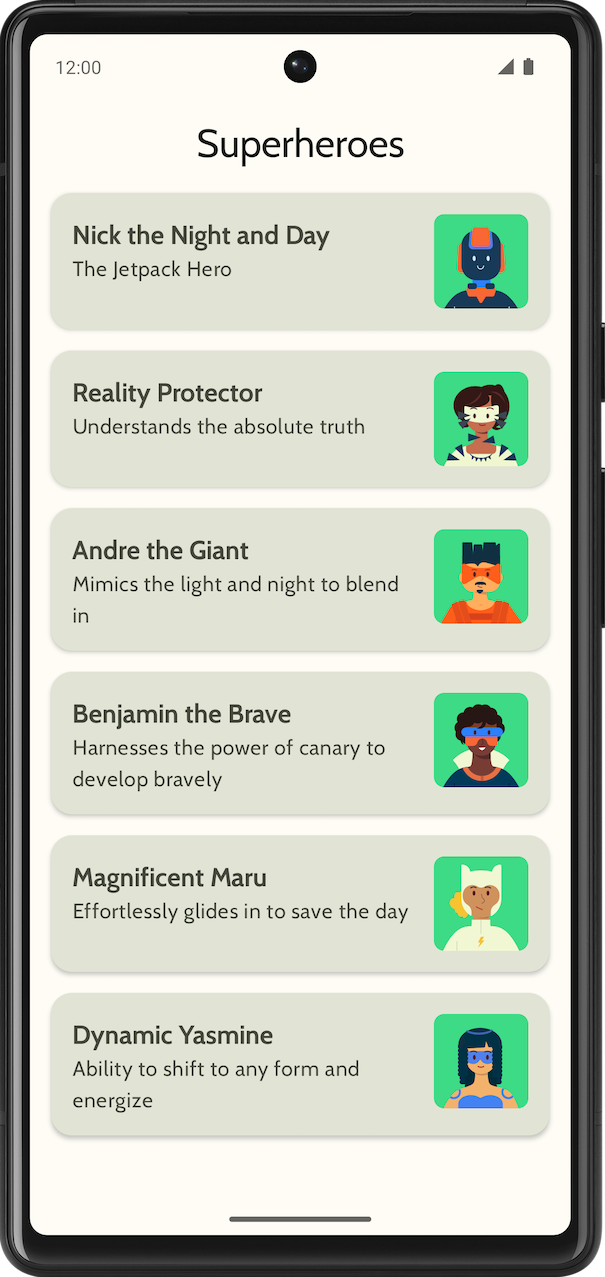 Nesta série de exercícios, você vai usar os conceitos do Programa de treinamentos para criar o app Superheroes. O foco é a criação dos componentes necessários para desenvolver uma lista rolável e uma interface sofisticada usando os princípios do Material Design abordados no codelab Temas do Material Design com o Jetpack Compose.