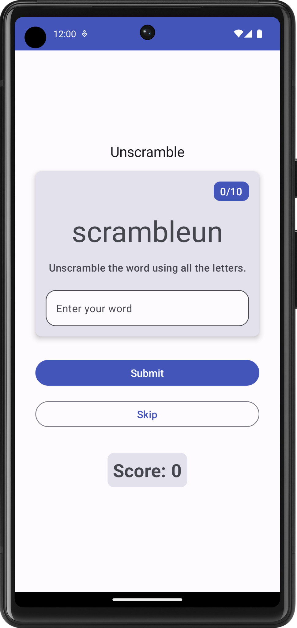 You will notice bugs in the app. The scrambled word does not display, but it is hardcoded to "scrambleun" and nothing happens when you tap the buttons.