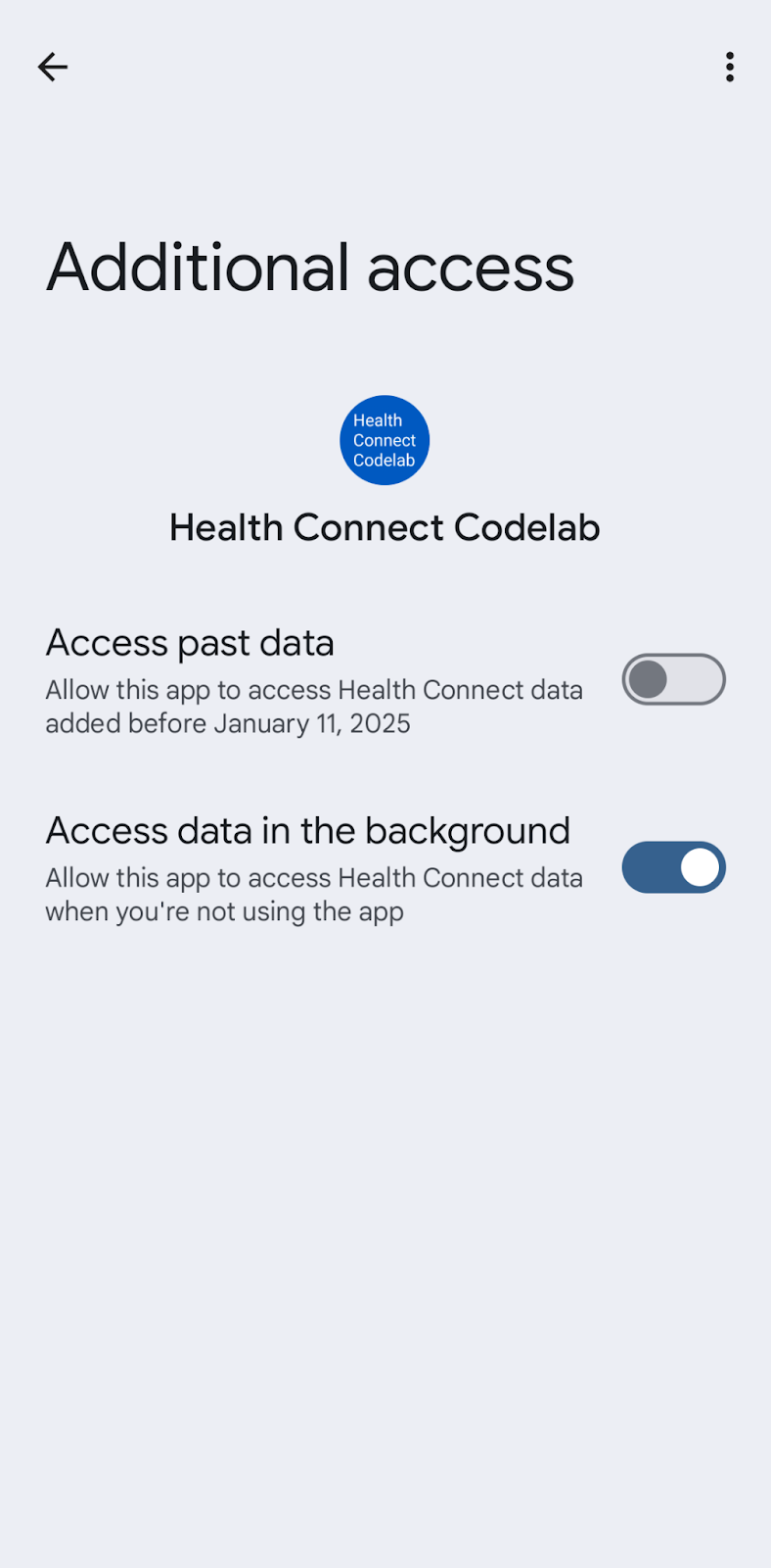 ユーザーは、システム設定で [ヘルスコネクト] > [アプリの権限] > [Health Connect Codelab] > [アクセス権の追加] > [過去のデータへのアクセス] に移動して、過去のデータの読み取り権限を付与することもできます。