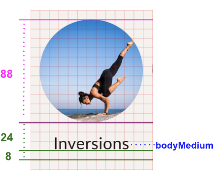 907293b875cba19e.pngスクリーンショットを見ただけでは、このデザインをピクセル単位で正確に実装することは困難です。一般的には、デザインに関してより詳しい情報がデザイナーから伝えられます。また、デザインツールへのアクセス権や、いわゆるレッドライン デザインが共有される場合もあります。今回は、デザイナーからレッドライン デザインを受け取り、そのデザインを使用してサイズの設定値を読み取ります。デザインは 8 dp グリッドがオーバーレイされて表示されるため、要素間および要素の周りのスペースのサイズを簡単に確認できます。また、若干の余白が追加されているため、正確なサイズを確認できるようになっています。