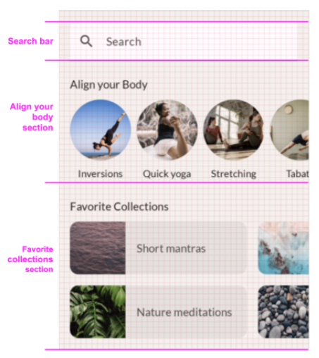 Nếu chỉ dựa vào ảnh chụp màn hình, sẽ rất khó để triển khai thiết kế một cách hoàn hảo về mặt điểm ảnh. Nhìn chung, một nhà thiết kế phải truyền tải nhiều thông tin hơn về thiết kế. Họ có thể cấp cho bạn quyền sử dụng công cụ thiết kế hoặc chia sẻ loại thiết kế đường viền màu đỏ. Trong trường hợp này, nhà thiết kế của chúng tôi chuyển giao thiết kế đường viền màu đỏ mà bạn có thể dùng để đọc mọi giá trị kích thước. Thiết kế được hiển thị với lớp phủ lưới 8 dp, do đó bạn có thể dễ dàng thấy khoảng cách giữa các phần tử và xung quanh. Ngoài ra, một số khoảng cách được thêm vào rõ ràng để làm rõ một số kích thước nhất định.