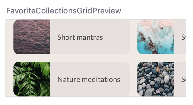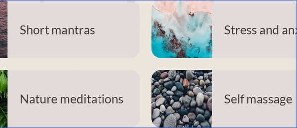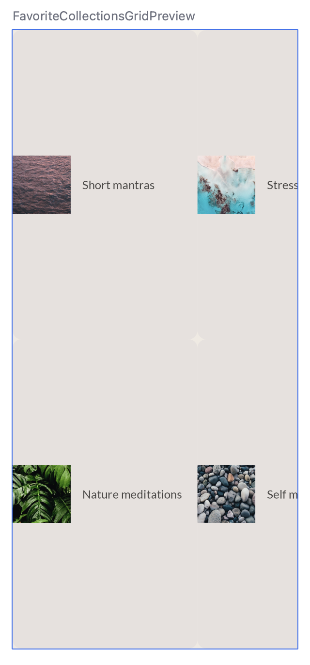 Trong lớp học lập trình này, bạn sẽ triển khai một thiết kế ứng dụng thực tế dựa trên các bản mô phỏng do nhà thiết kế cung cấp. MySoothe là một ứng dụng bảo vệ sức khỏe liệt kê nhiều cách để cải thiện cơ thể và tâm trí của bạn. Ứng dụng này có một phần liệt kê các bộ sưu tập yêu thích của bạn và một phần chứa các bài tập thể dục. Giao diện của ứng dụng: