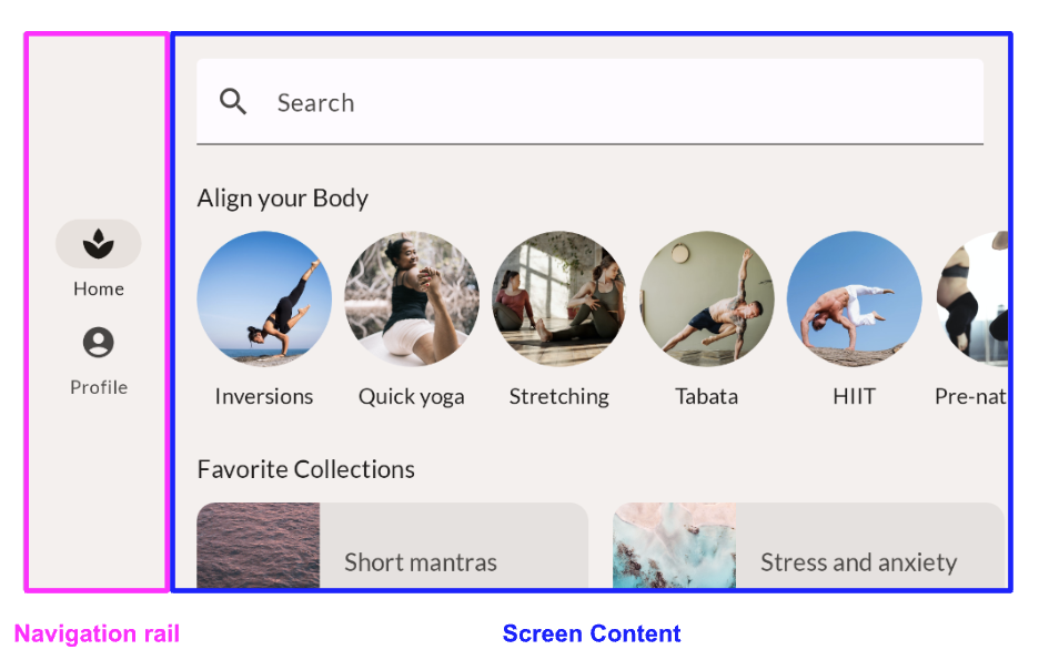 Khi tạo bố cục cho các ứng dụng, bạn cũng cần lưu ý đến giao diện của ứng dụng trong nhiều cấu hình, bao gồm cả chế độ ngang trên điện thoại. Đây là thiết kế của ứng dụng ở chế độ ngang, hãy chú ý đến cách thanh điều hướng phía dưới chuyển thành một dải ở bên trái của nội dung trên màn hình.