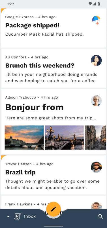 view.doOnPreDraw { startPostponedEnterTransition() }尝试再次运行该应用。如果您打开一个电子邮件,然后按返回按钮,打开的电子邮件就会重新收起到列表中。很好!接下来,让我们继续改进动画。