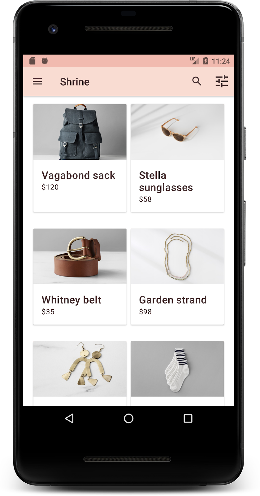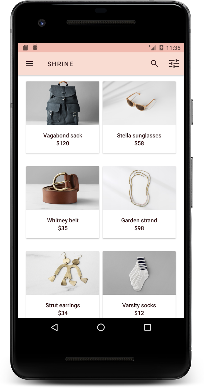 在 Codelab MDC-101 和 MDC-102 中,您使用 Material Components (MDC) 为名为 Shrine 的应用构建了基础内容。Shrine 是一款销售服饰和家居用品的电子商务应用。该应用包含的用户流从登录屏幕开始,然后将用户转到显示商品的主屏幕。