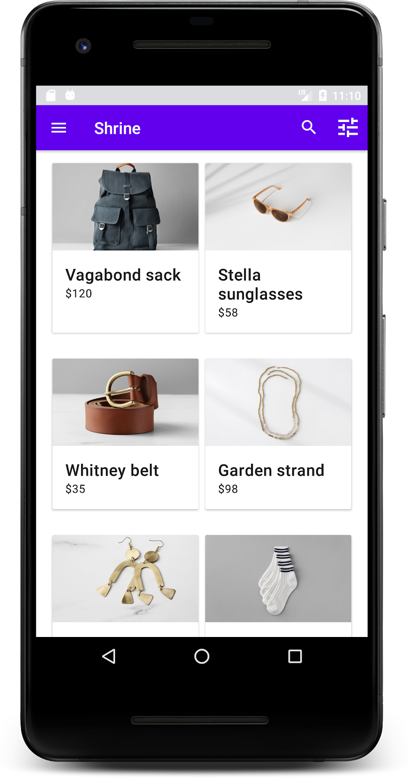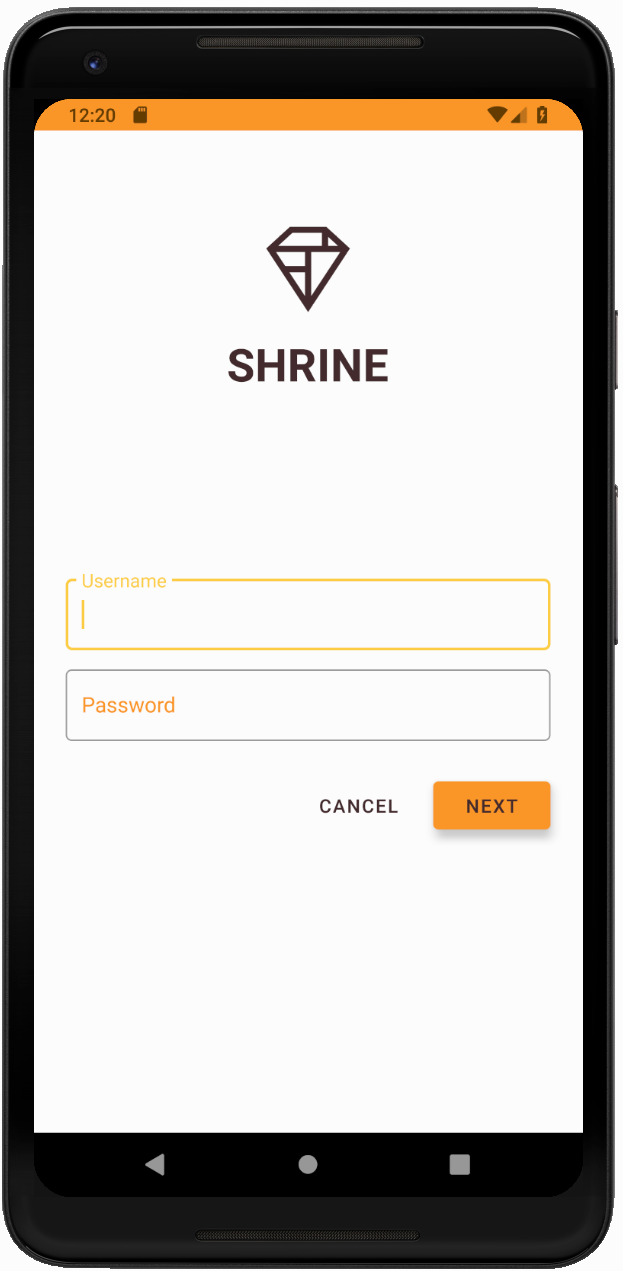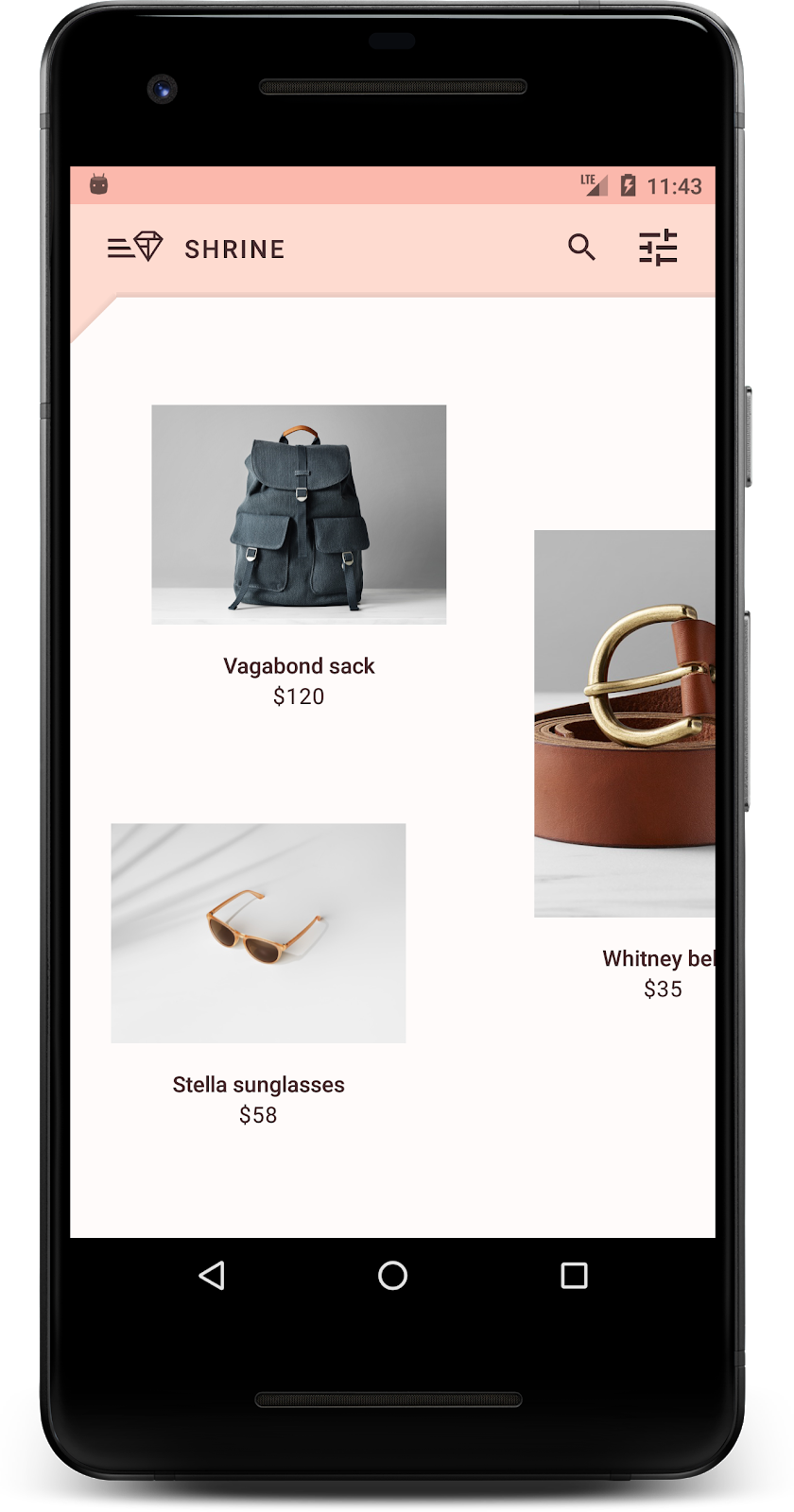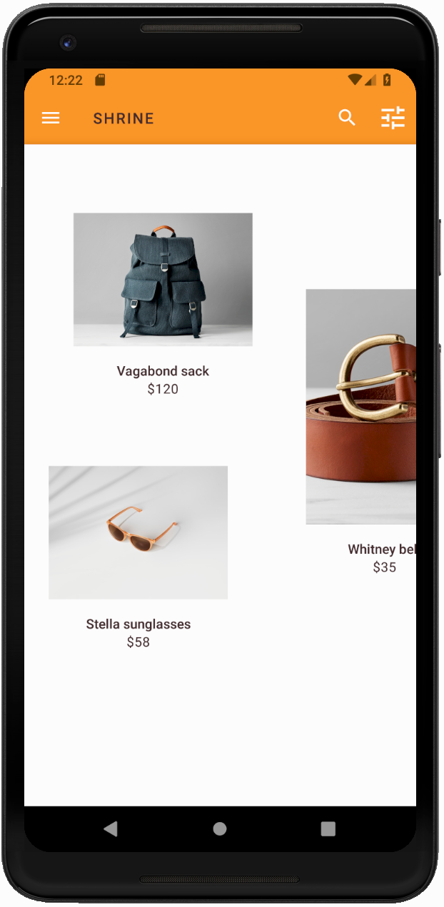 在 Codelab MDC-101 和 MDC-102 中,您使用 Material Components (MDC) 为名为 Shrine 的应用构建了基础内容。Shrine 是一款销售服饰和家居用品的电子商务应用。该应用包含的用户流从登录屏幕开始,然后将用户转到显示商品的主屏幕。