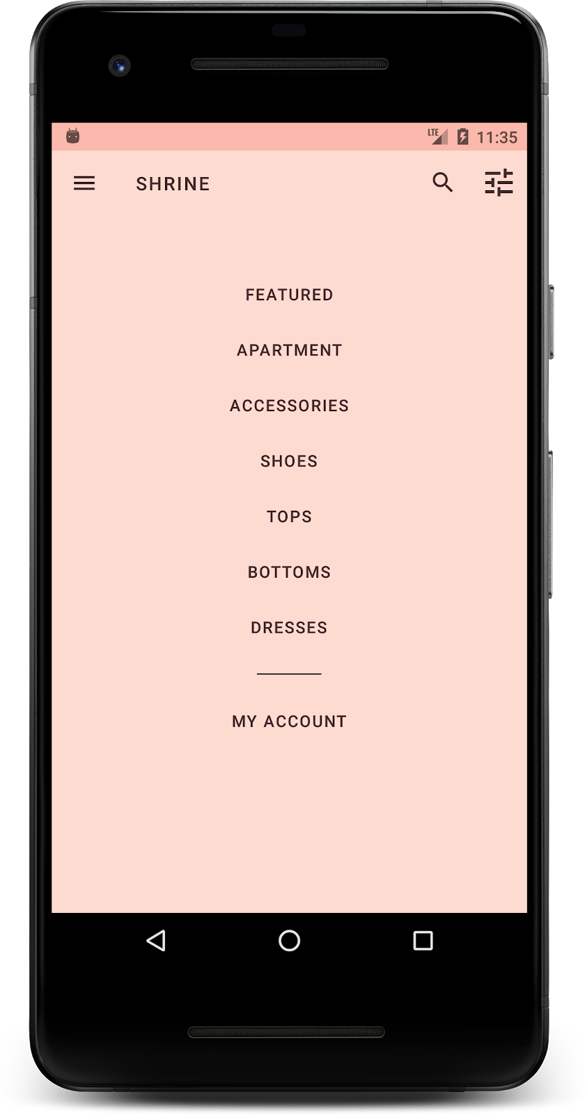 大功告成!您应该会看到在您设备上运行的 Shrine 应用。