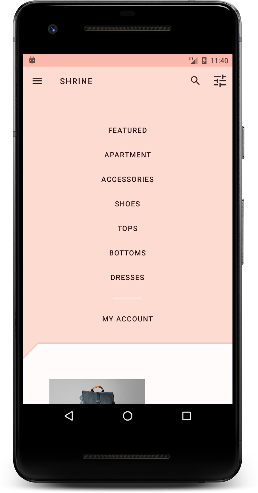 如需完成此 Codelab 的进一步挑战,请修改您的 Shrine 应用,以更改从背景幕菜单中选择某个类别后显示的商品图片。