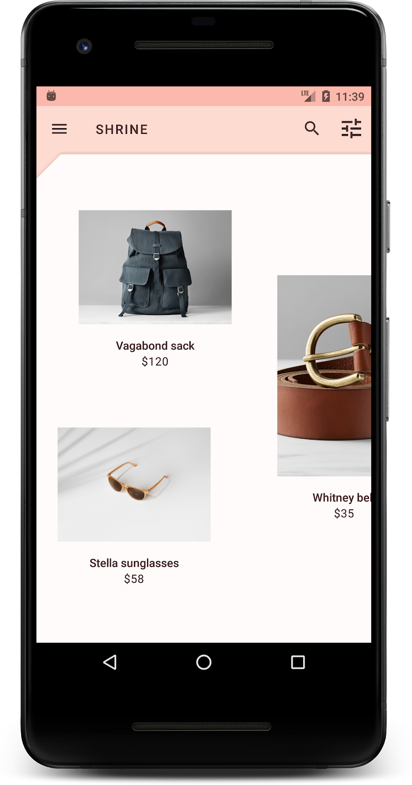 大功告成!您应该会看到在您设备上运行的 Shrine 应用。