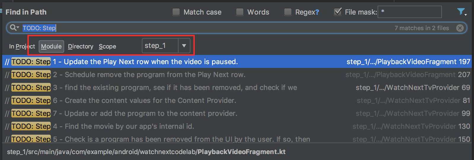 另一个模块可用作检查点,在整个过程中的每个步骤中,您都可以将您的工作成果与对应的解决方案进行比较。“step_final”模块是完整应用,而其他 step_X 模块只是完成此 Codelab 中的相应步骤后的状态。