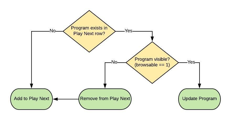当用户将某个节目添加到“接下来播放”行后,系统会发送包含“接下来观看”节目 ID 和频道中的节目 ID 的 intent。该应用会使用节目 ID 来查找要添加到应用观看列表的相应电影。
