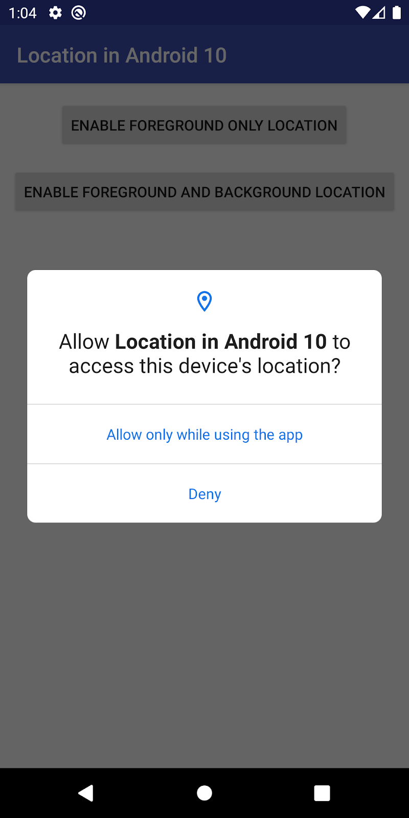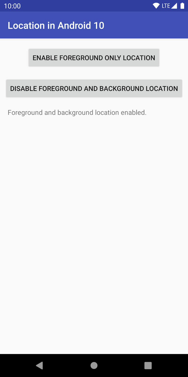 - 您可以随意点按位置信息按钮。该应用已正常运行,并可针对前台以及前台和后台位置信息提供位置信息跟踪服务。现在,我们要让该应用能够在 Android 10 上运行。