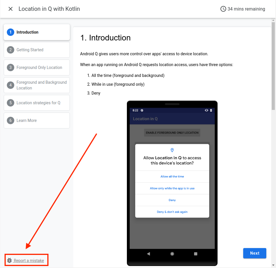 如果您在学习此 Codelab 时遇到任何问题(代码错误、语法错误、内容含义不清等),请通过 Codelab 左下角的报告错误链接报告相应问题。