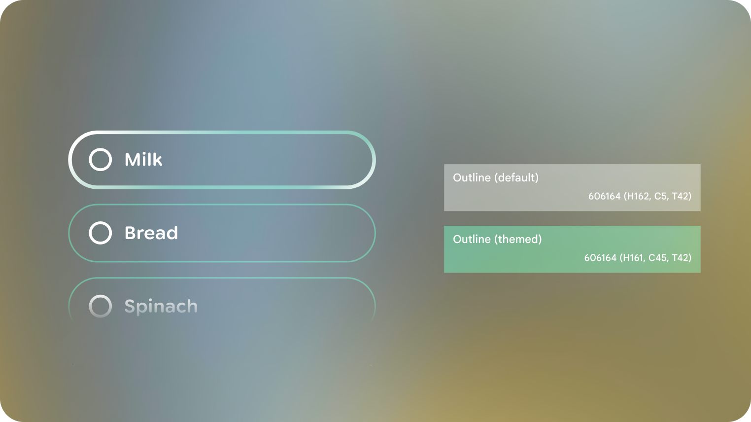 Das Farbschema der Brille (Sammlung von Farb-Tokens oder Rollen zum Festlegen der Farbe Ihrer App) besteht aus drei Akzentrollen, vier Oberflächenrollen (oder neutralen Rollen) und den entsprechenden On-Color-Rollen. Die Farbrollen ähneln den Rollen des mobilen Schemas und sollten auf dieselbe Weise verwendet werden.