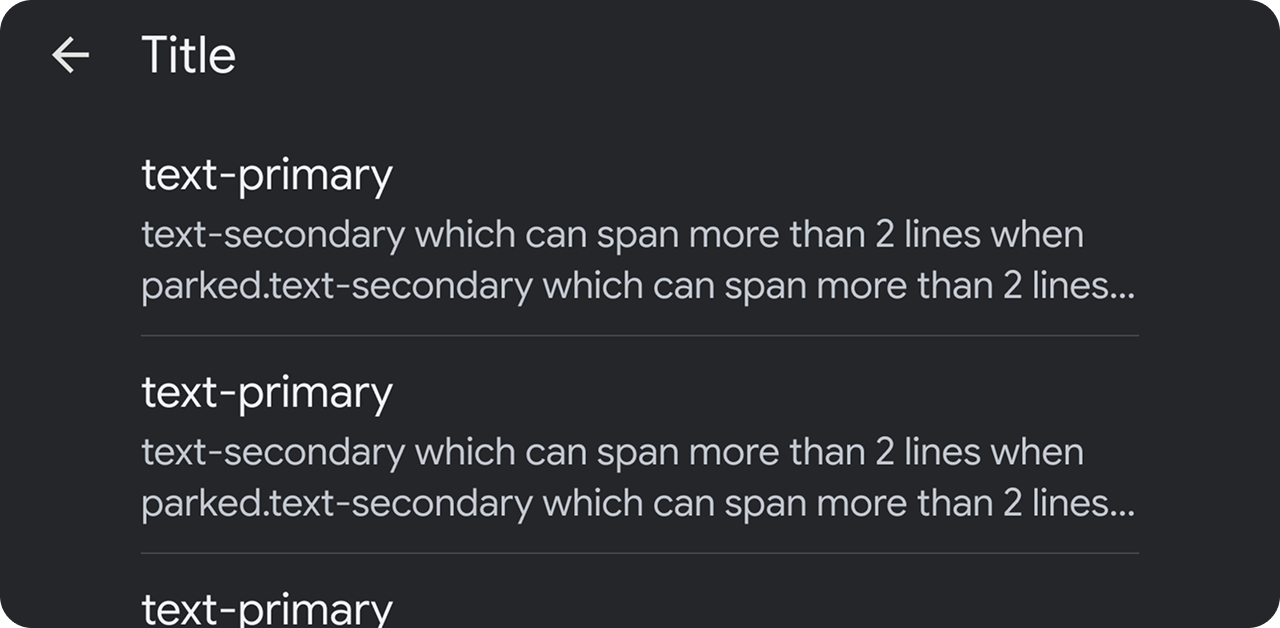 - আইটেম প্রতি পাঠ্যের পরিমাণ। পার্ক করা অবস্থায় তালিকার সারিতে সেকেন্ডারি টেক্সট 2 সারির থেকে দীর্ঘ হতে পারে। পার্ক করার সময় আরও তালিকার পাঠ্য দেখুন।