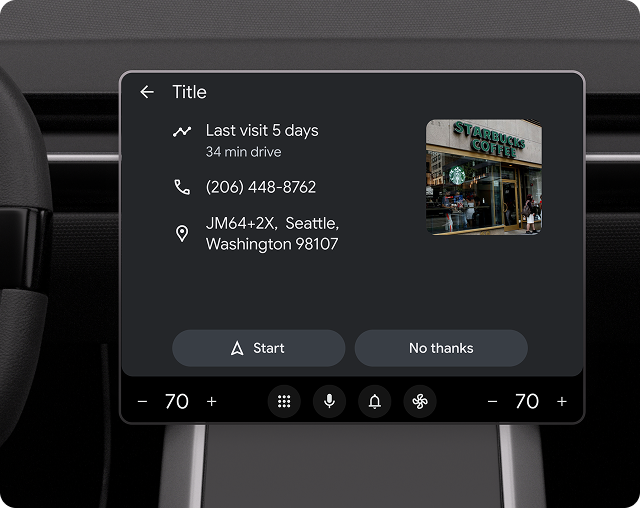 पार्किंग की जगह की जानकारी देने वाले ऐप्लिकेशन की जानकारी. इसमें दो कार्रवाइयां शामिल हैं: शुरू करें और अभी नहींकैफ़े की जगह की जानकारी. इसमें दो कार्रवाइयां शामिल हैं. आकार की सीमाओं की वजह से, दूसरे ऐक्शन बटन से जुड़ा टेक्स्ट छिपा हुआ है और सिर्फ़ उसका आइकॉन दिख रहा है.