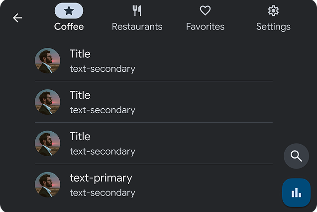 - Barra de guias com ícone do app e até quatro guias. Cada guia precisa ter um ícone e um título.