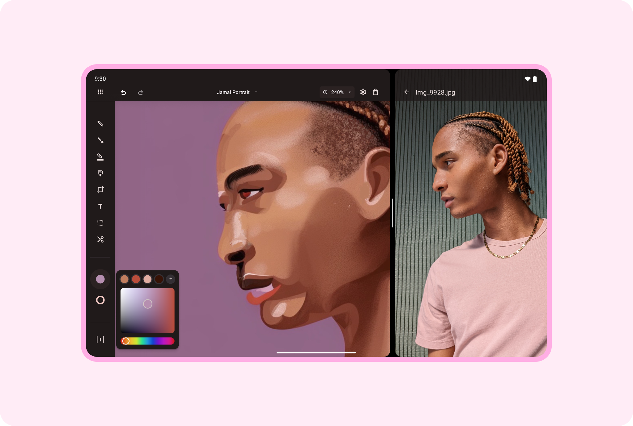 แสดงโมเดลอ้างอิงที่ด้านหนึ่งของหน้าจอและแอปวาดภาพที่อีกด้านหนึ่ง