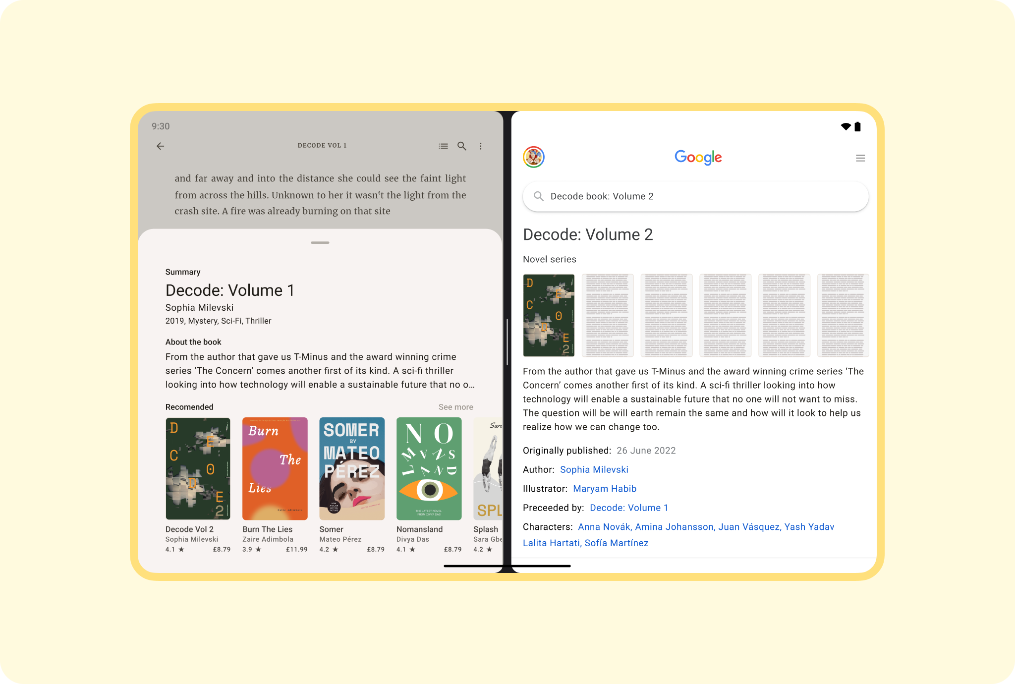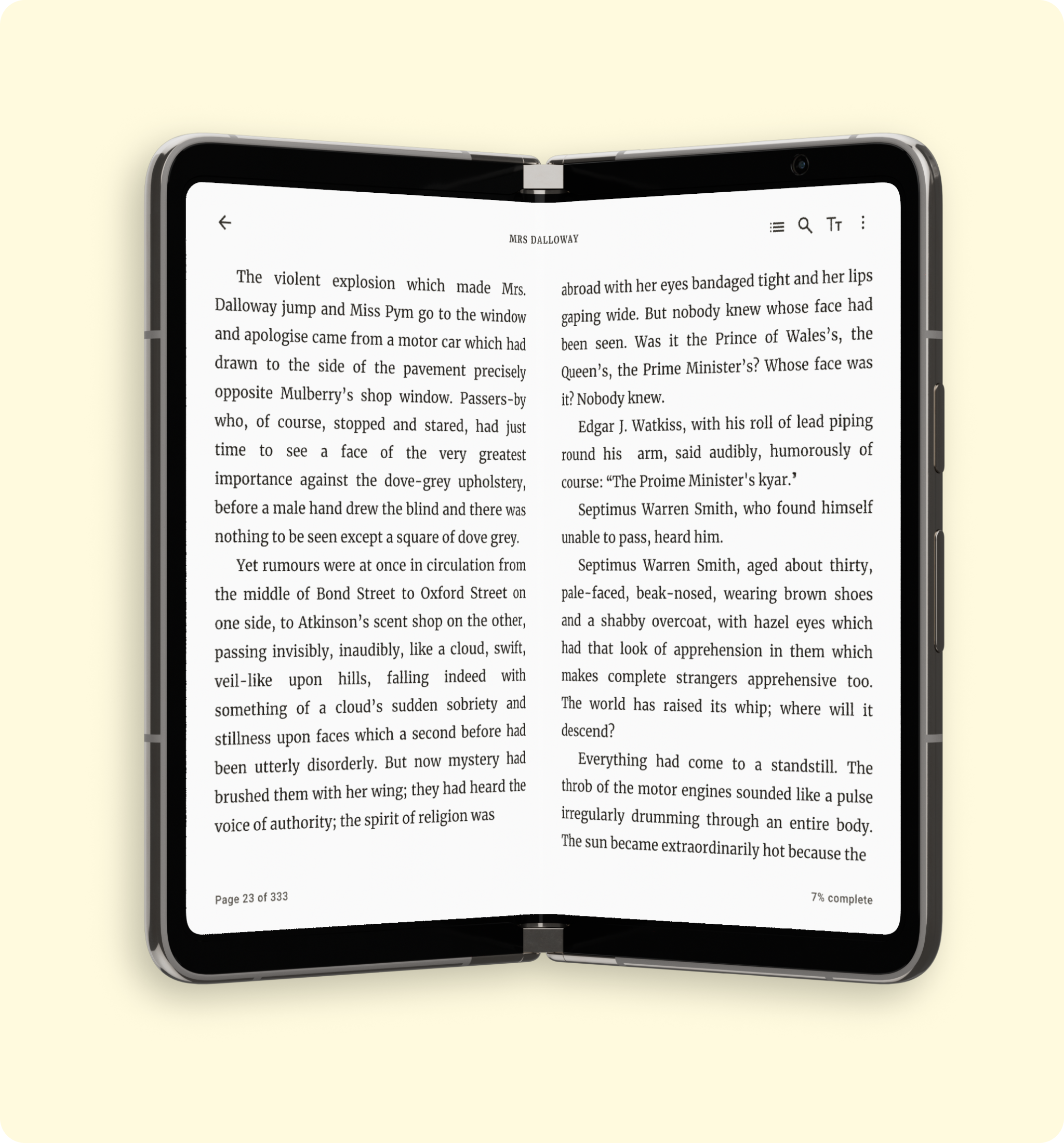 Foldables have the angle on e-books. Capture the experience of reading a real book with a two-page layout on a large screen foldable open like a bound book. It's an e-book in fact, form, and function.