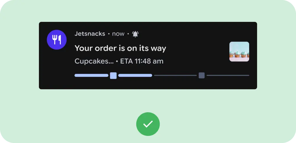 Gli aggiornamenti in tempo reale forniscono un riepilogo degli aggiornamenti importanti in modo che gli utenti possano monitorare l'avanzamento senza aprire l'app. Gli utenti possono ignorare o declassare temporaneamente una notifica di aggiornamento in tempo reale a una notifica standard. Le notifiche degli aggiornamenti in tempo reale devono seguire i principi delle notifiche per fornire informazioni brevi, tempestive e pertinenti.