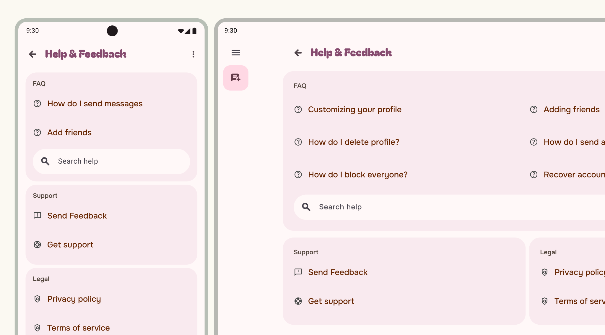 Pour obtenir des consignes de conception sur l'adaptation des mises en page aux tailles d'écran étendues, consultez le guide du développeur Compatibilité avec différentes tailles d'écran dans Compose et la page Appliquer une mise en page de M3. Vous pouvez également consulter la galerie Android Canonical pour grand écran pour trouver l'inspiration et découvrir comment implémenter des mises en page pour grand écran.