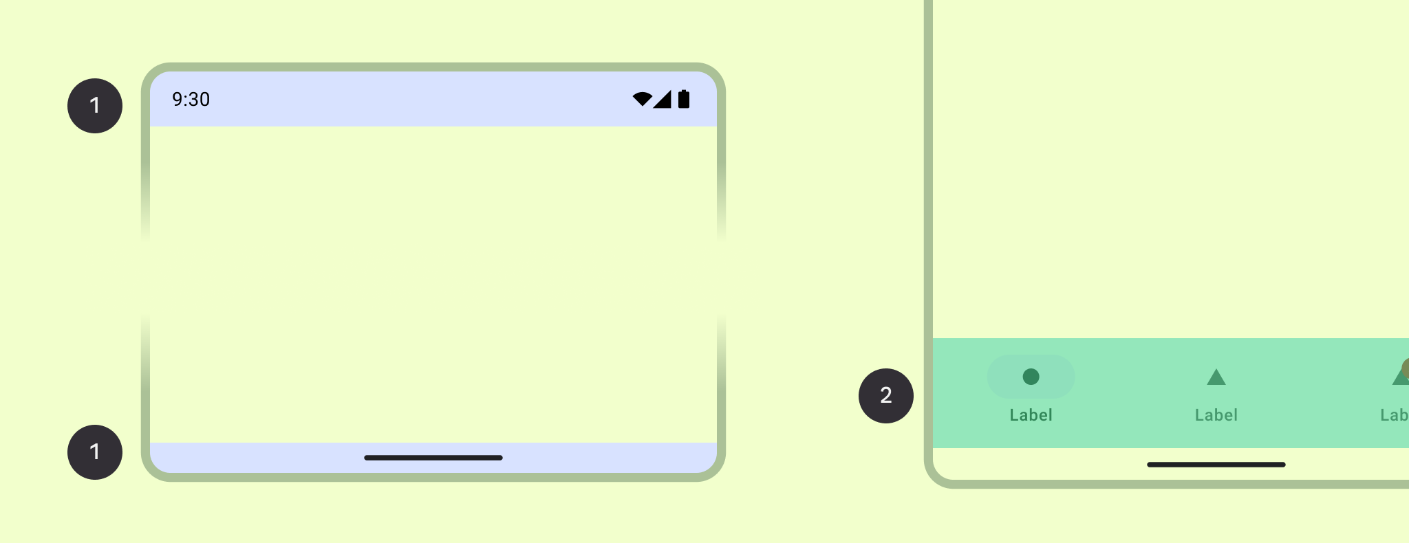탐색 영역은 사용자가 앱에서 이동하고, 중요한 작업에 액세스하고, Android 플랫폼의 여러 곳을 이동할 수 있도록 지원하는 각종 어포던스를 나타냅니다.