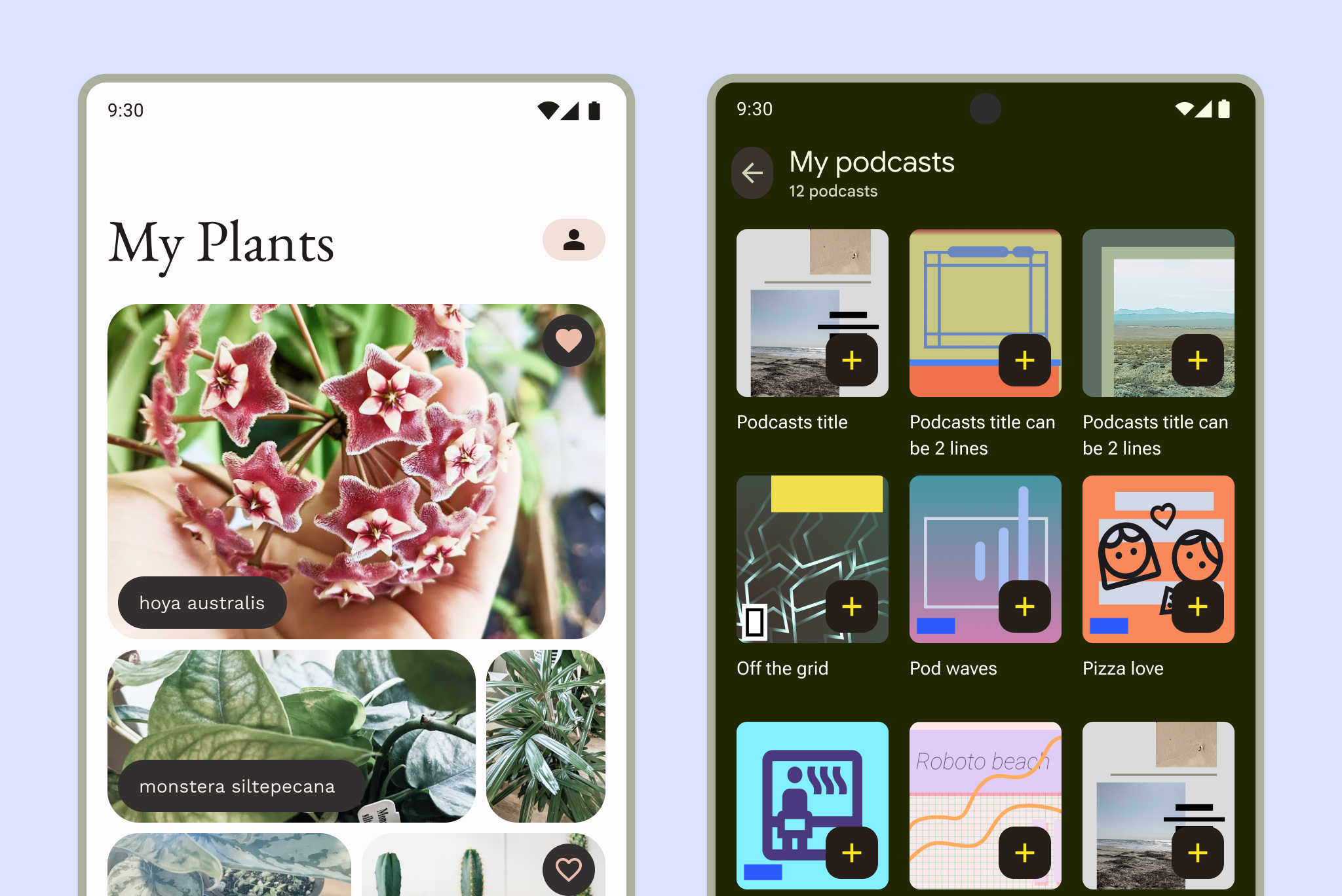 เลย์เอาต์ฟีดจะจัดเรียงองค์ประกอบเนื้อหาที่เทียบเท่ากันในตารางกริดที่กำหนดค่าได้เพื่อให้ ดูเนื้อหาจำนวนมากได้อย่างรวดเร็วและสะดวก ดูข้อมูลเพิ่มเติมเกี่ยวกับ หลักเกณฑ์ Material 3 สำหรับการใช้การ์ดในคอลเล็กชัน ฟีดอาจเป็นการกำหนดค่าแบบรายการหรือแบบตารางกริดบนจอแสดงผลขนาดกะทัดรัด โดยมักจะอยู่ในรูปแบบการ์ดหรือ ไทล์ เนื้อหาอาจเป็นแบบไดนามิก ซึ่งหมายความว่า "ป้อน" จากแหล่งที่มาภายนอกแบบไดนามิก เช่น API