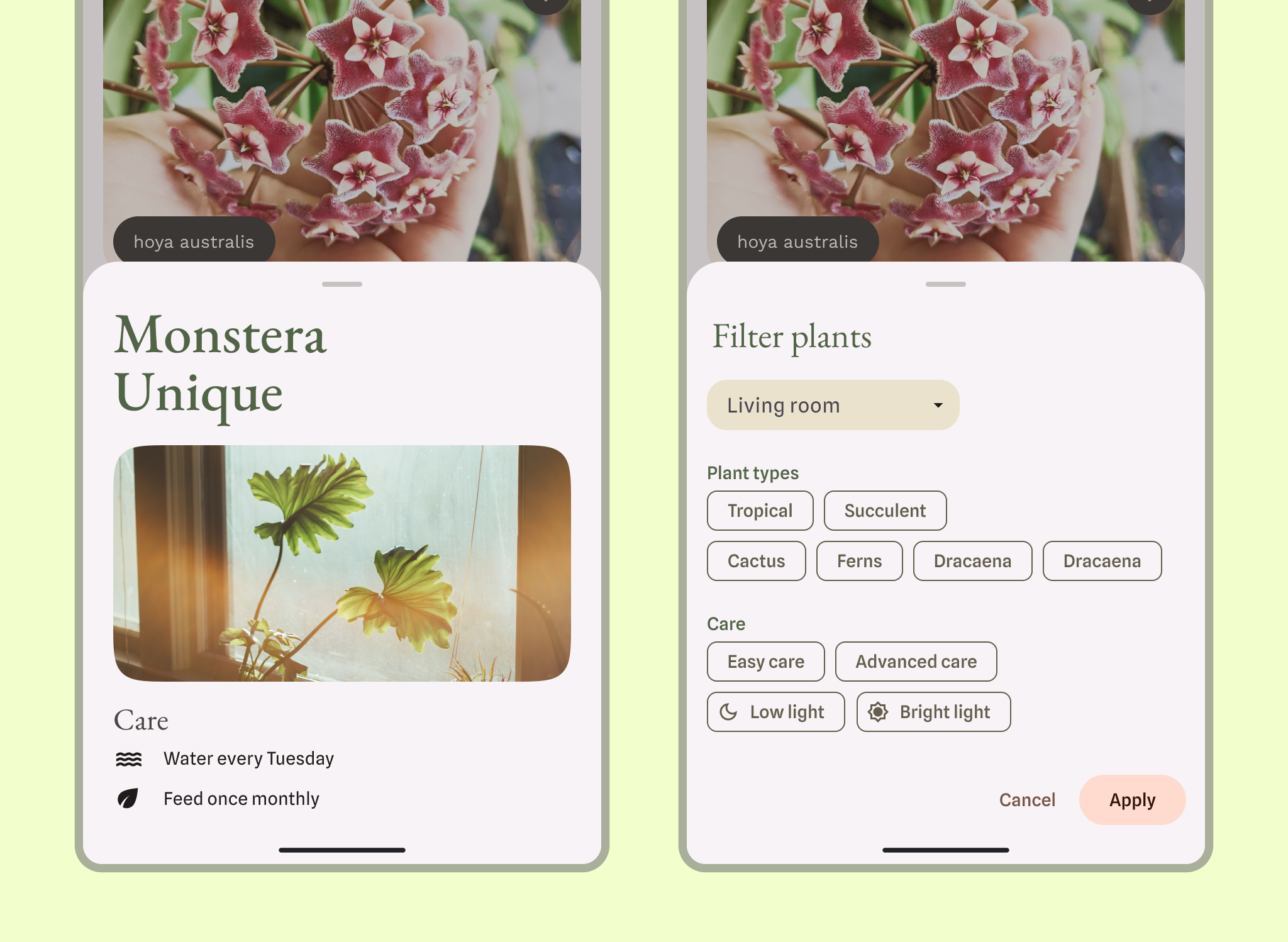 มุมมองบนอุปกรณ์เคลื่อนที่อาจต้องมีเนื้อหาหรือการควบคุมที่รองรับ โดยปกติแล้วจะอยู่ในรูปแบบของชีตหรือกล่องโต้ตอบ ซึ่งช่วยให้มุมมองหลักยังคงโฟกัสและ ไม่รก ดูคำแนะนำ M3 สำหรับการใช้เลย์เอาต์ Canonical ของแผงสนับสนุน