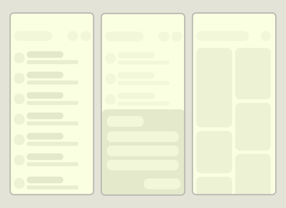 Un diseño de feed dispone elementos de contenido equivalentes en una cuadrícula configurable para permitir una visualización rápida y conveniente de una gran cantidad de contenido. Obtén más información en los lineamientos de Material 3 para usar tarjetas en una colección. Los feeds pueden tener una configuración basada en listas o cuadrículas en pantallas compactas, por lo general, en tarjetas o mosaicos. El contenido puede ser dinámico, lo que significa que se "transmite" desde una fuente externa dinámica, como una API.