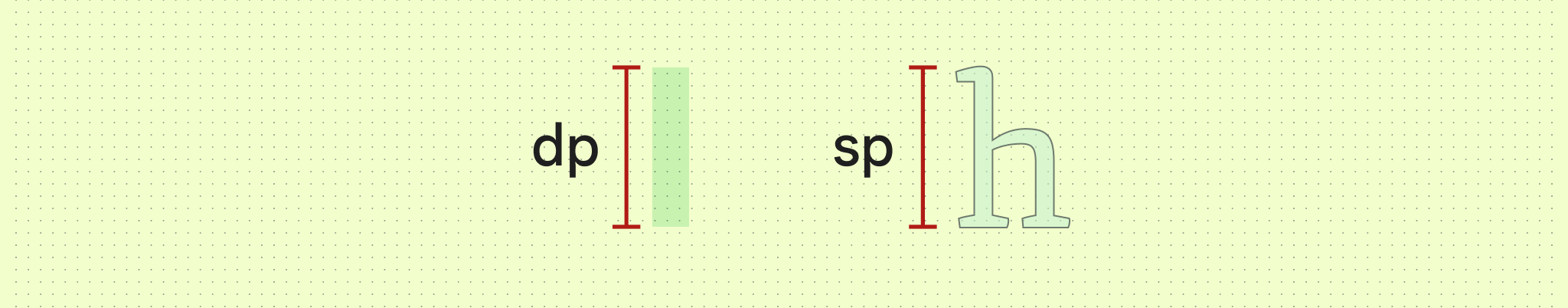 - פיקסלים שניתן לשנות (sp): פיקסלים שניתן לשנות משמשים לאותה מטרה כמו dp, אבל לגופנים. ערך ברירת המחדל של sp זהה לערך ברירת המחדל של dp. מערכת Android מחשבת את גודל הגופן בפועל שבו יש להשתמש על סמך המכשיר וההעדפה של המשתמש שהוגדרה באפליקציית ההגדרות במכשיר Android.