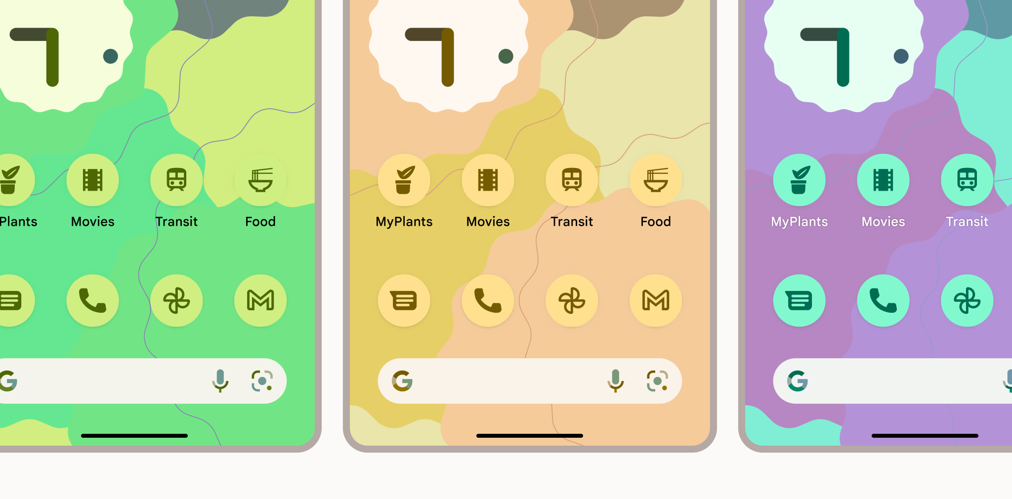طرحهای زمینه تولید شده توسط کاربر توسط رنگ پویا پشتیبانی میشوند که ما با Material You در Android 12 در دسترس قرار دادهایم. وقتی فعال باشد، رنگ پویا رنگهای سفارشی را از کاغذدیواری کاربر استخراج میکند تا روی برنامهها و رابط کاربری سیستم اعمال شود. این پالت رنگ به عنوان نقطه شروع برای تولید طرح های رنگی روشن و تیره استفاده می شود.