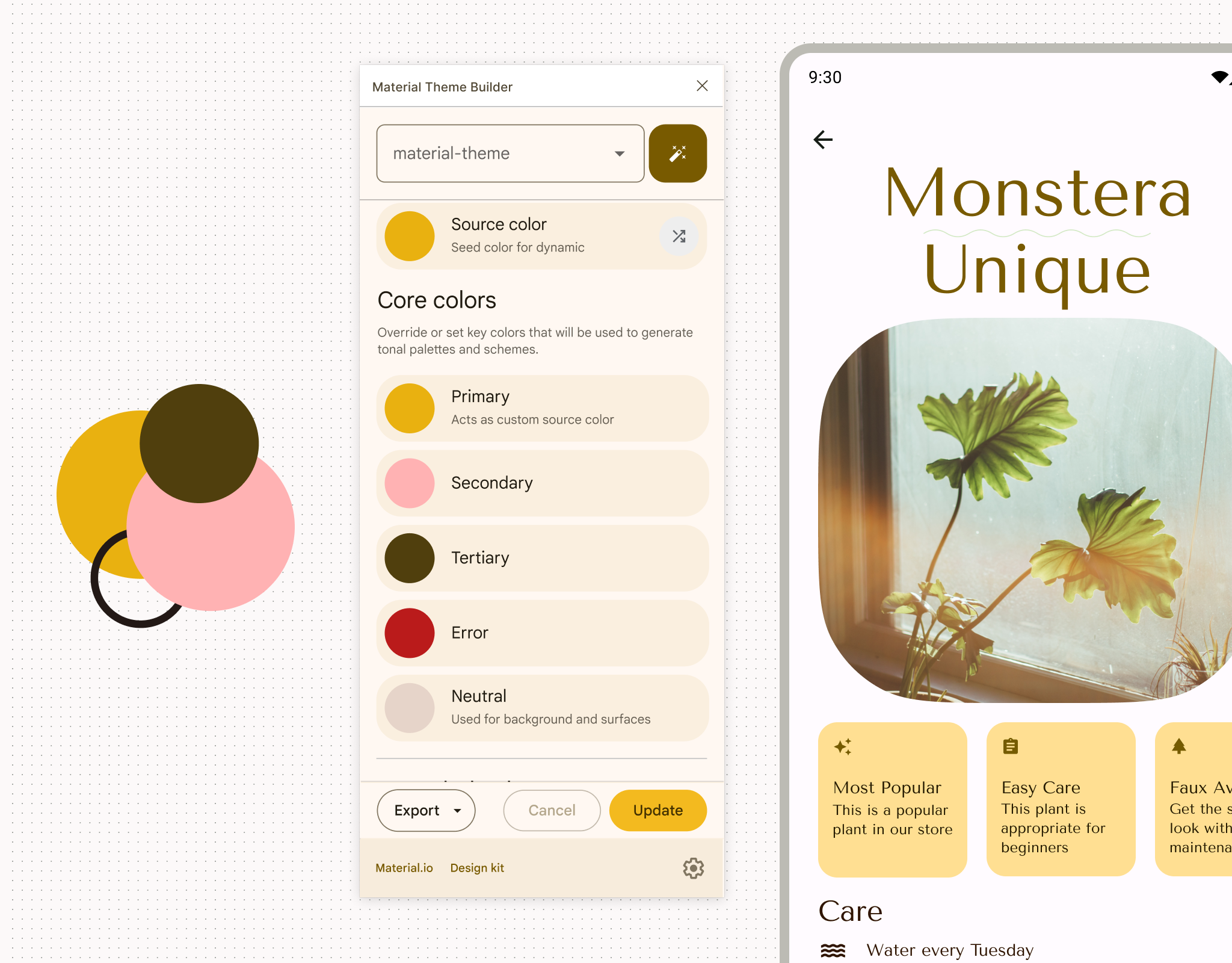 אתם יכולים להשתמש בפלאגין Figma של Material Theme Builder כדי להתאים אישית עיצוב של Material Theme. כשיוצרים עיצוב באמצעות הכלי הזה, מקבלים קובצי עיצוב שאפשר להטמיע עם ערכות צבעים בהירות וכהות שכבר נוצרו. כך אפשר להמשיך להתאים אישית את העיצוב על ידי עדכון קובץ העיצוב שיוצאו עם הערכים המדויקים שלכם.