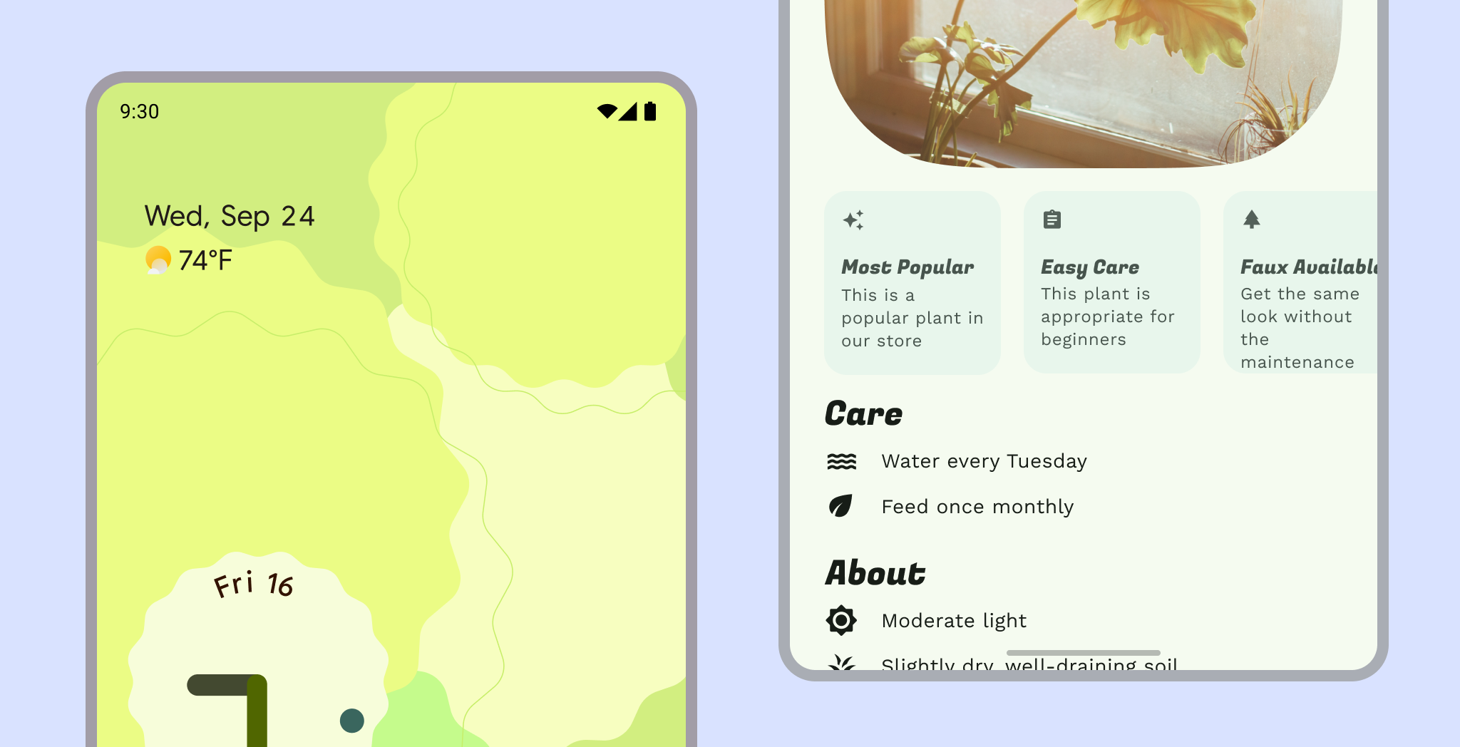 שימוש בעיצובים מותאמים אישית מאפשר לכם להביע את עצמכם בצורה רחבה יותר במראה ובתחושה של האפליקציה, או לשמש כחלופה במקרים שבהם עיצובים מסוימים של מערכת לא זמינים. האפשרות הזו שימושית גם אם אתם עובדים עם מערכת עיצוב מותאמת אישית מלאה, גם אם יש לכם מדריך מותג קטן וגם אם יש לכם כמה צבעים אהובים.