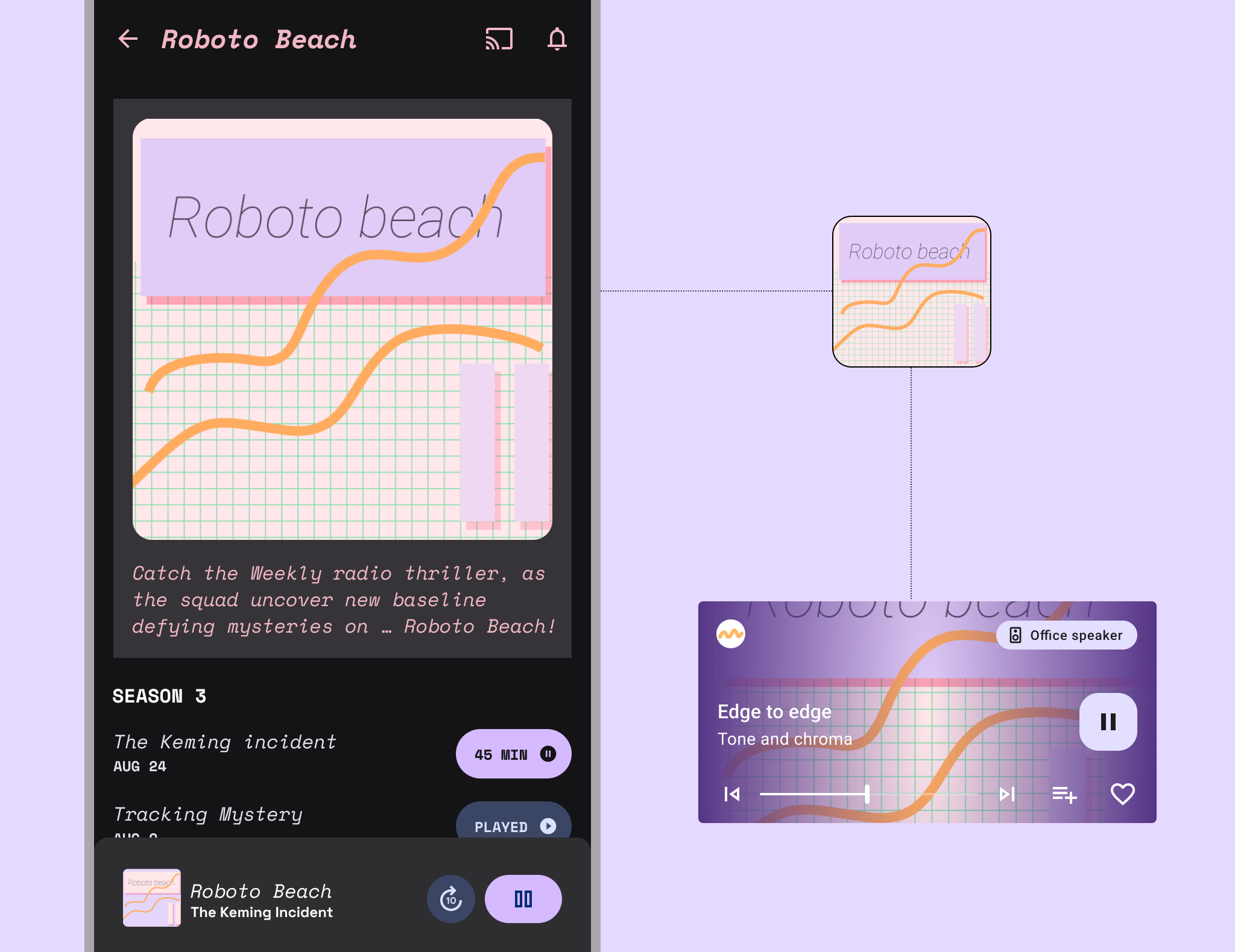 כדי להדגיש תוכן מסוים, אפשר להשתמש בממשק המשתמש בצבע דינמי כדי לרשת את הצבע מהתוכן הזה. הצבע של התוכן מתאים למקור תוכן ראשי אחד, אבל חשוב להשתמש בו בזהירות בתצוגות עם כמה מקורות תוכן.