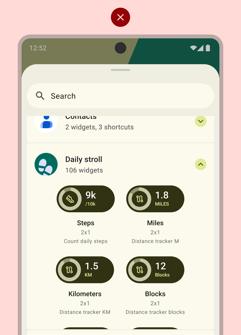 אפליקציות יכולות לתמוך במספר בלתי מוגבל של ווידג'טים. עם זאת, בוחר הווידג'טים צריך להתמקד בהצגת משימות קריטיות בלבד ווריאציות מועילות. הגבלת התצוגה המקדימה של כלי בחירת הגבול ל-6 עד 8 וריאציות. אפשר לתת גישה לווריאציות נוספות באמצעות מסך אישור.