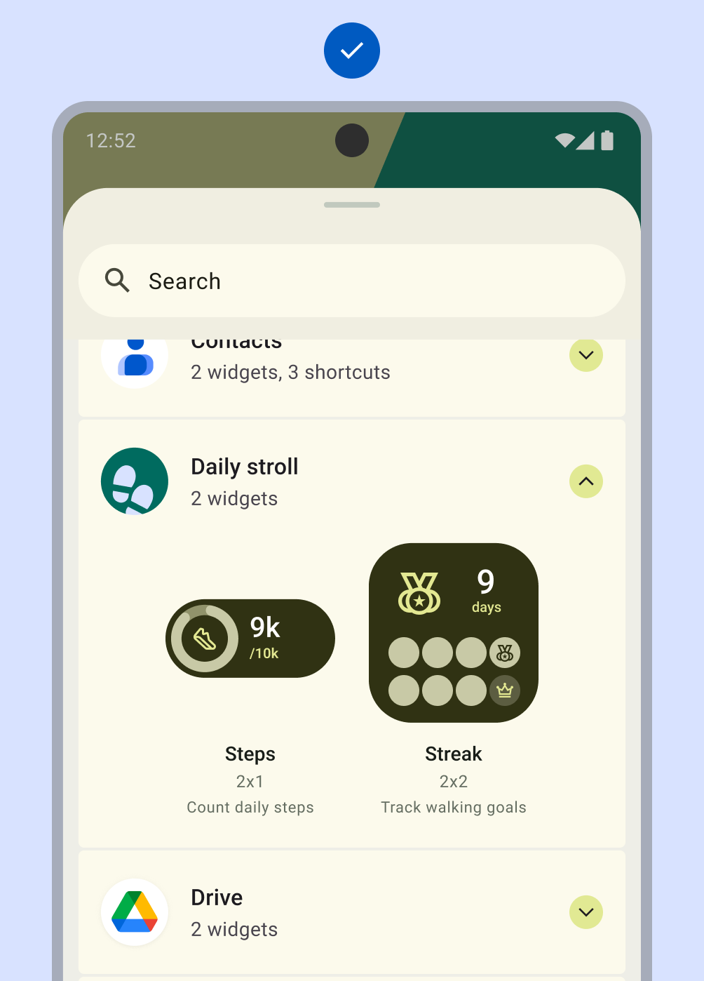 讓使用者在選取小工具後,或透過按住小工具的方式,設定小工具並顯示在主畫面上。請考量自訂功能對小工具體驗的重要性,再決定何時開放使用。