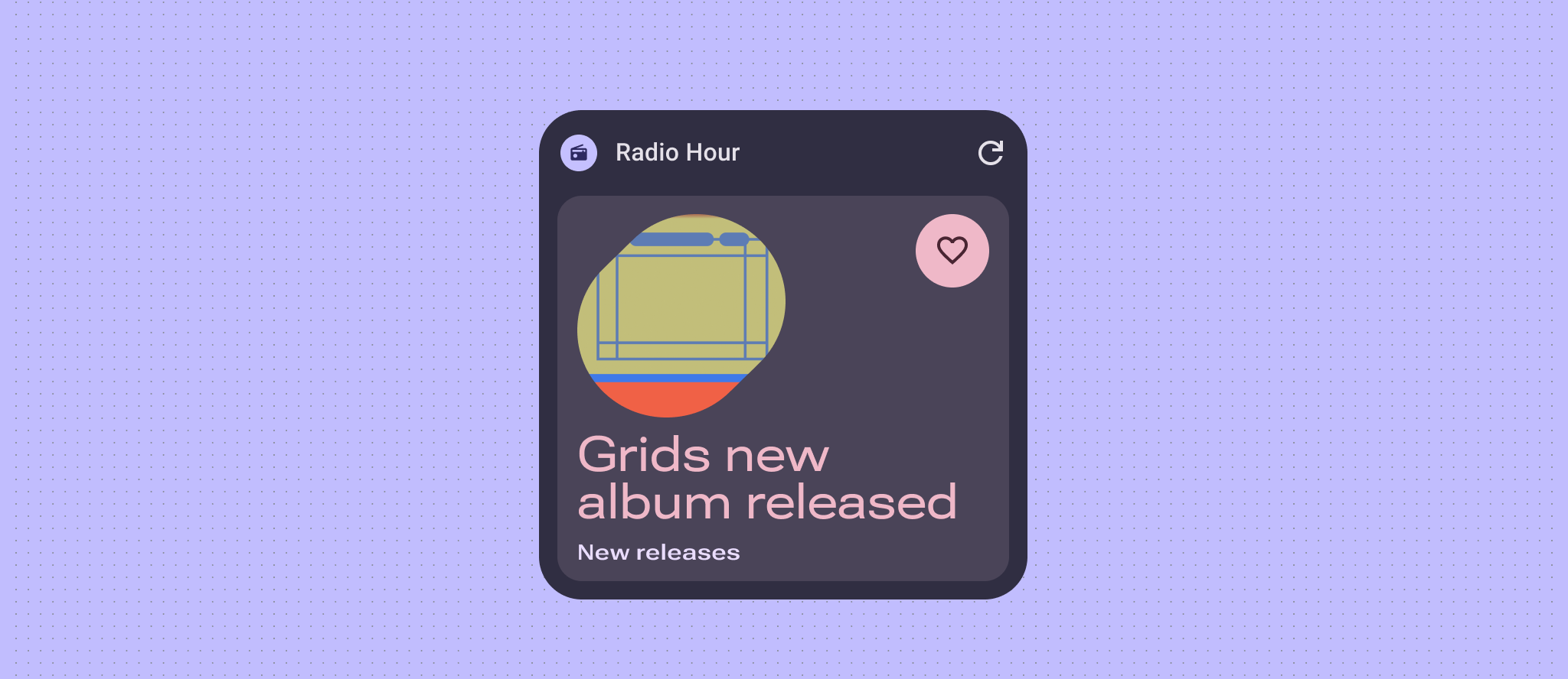 如果您的 widget 显示的数据内容很少,例如照片、天气或当前歌曲播放信息,那么不妨尝试将整个 widget 设置为富有表现力的形状,为用户的主屏幕带来令人兴奋的活力。如果您有更复杂的布局和数据,不妨考虑使用灵动形状来呈现视觉层次结构,突出显示新内容或号召性用语。