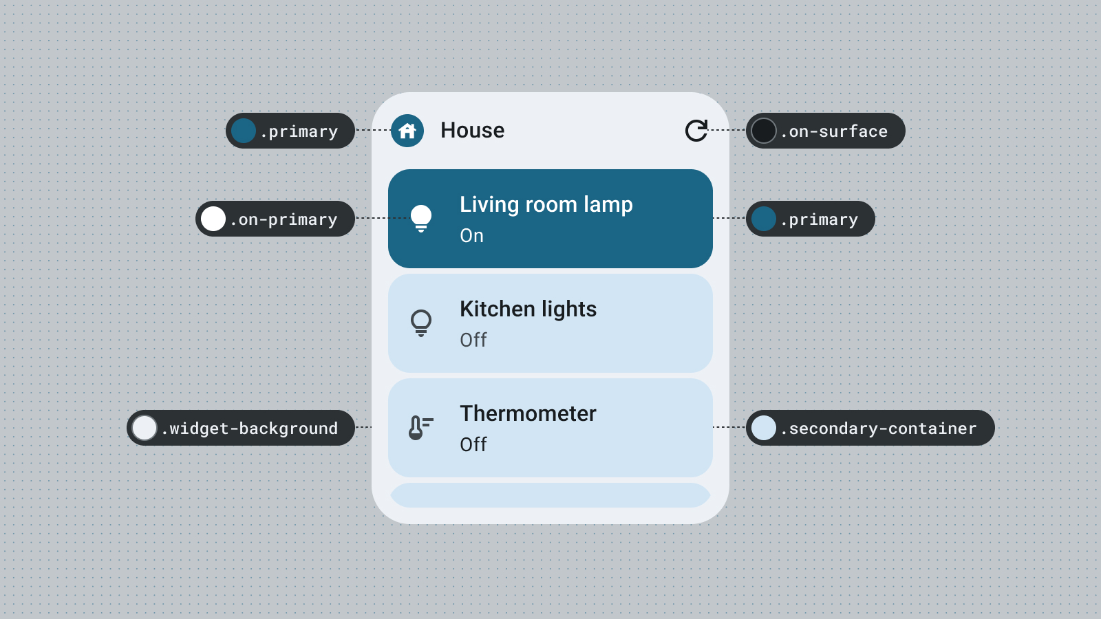 Starting in Android 12, a widget can use the device theme colors for buttons, backgrounds, and other components. This provides visual consistency across different widgets, home screen icons, and wallpapers, offering Android users a more cohesive user experience. Using the provided color tokens helps your widget look integrated across device themes provided by different device manufacturers and the dynamic themes set by the user.