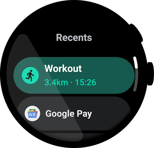 Wear OS की मदद से, उपयोगकर्ता आसानी से बैकग्राउंड में चल रही गतिविधियों पर वापस जा सकते हैं. जैसे, टाइमर, मीडिया सेशन, और कसरत.