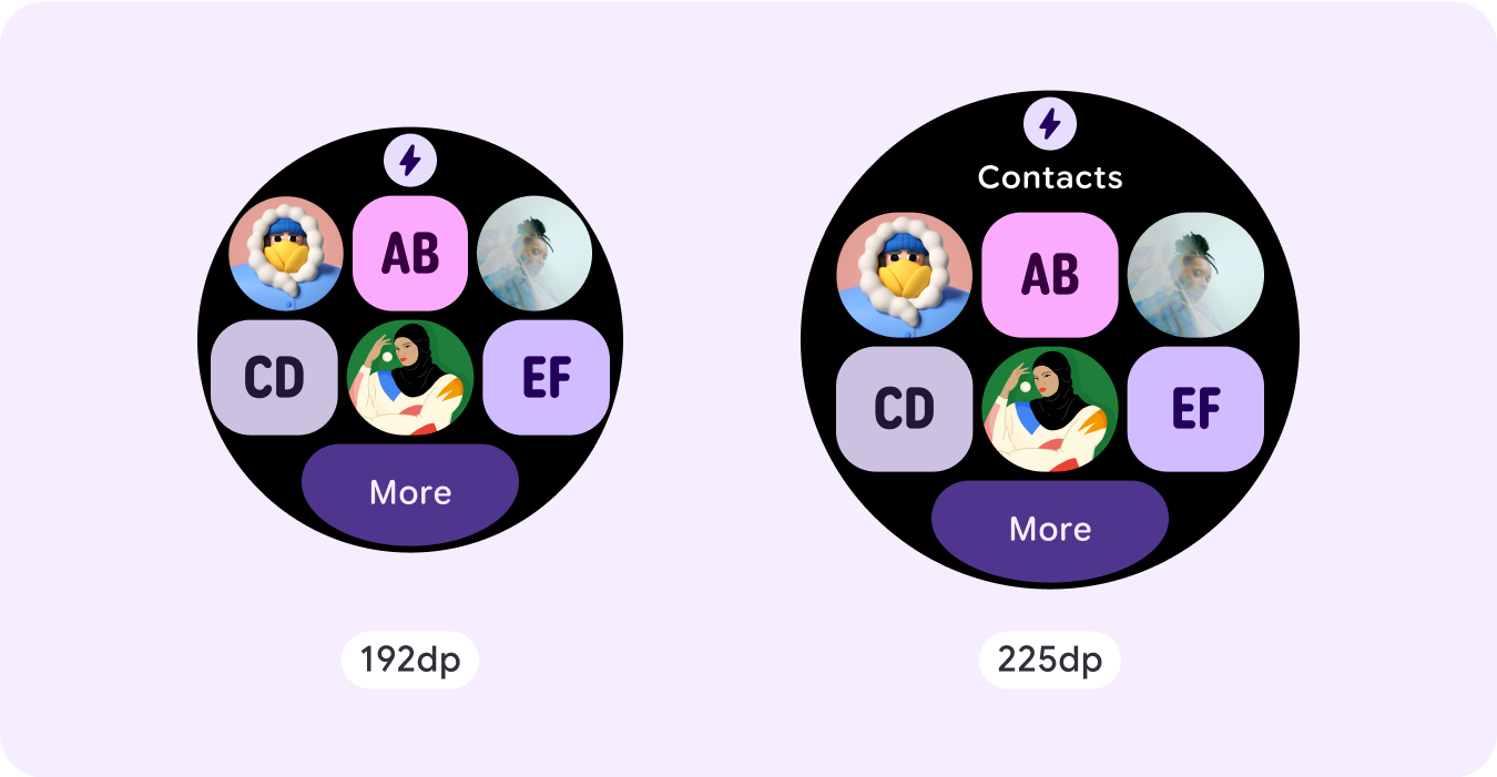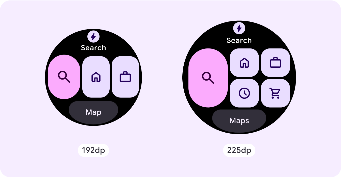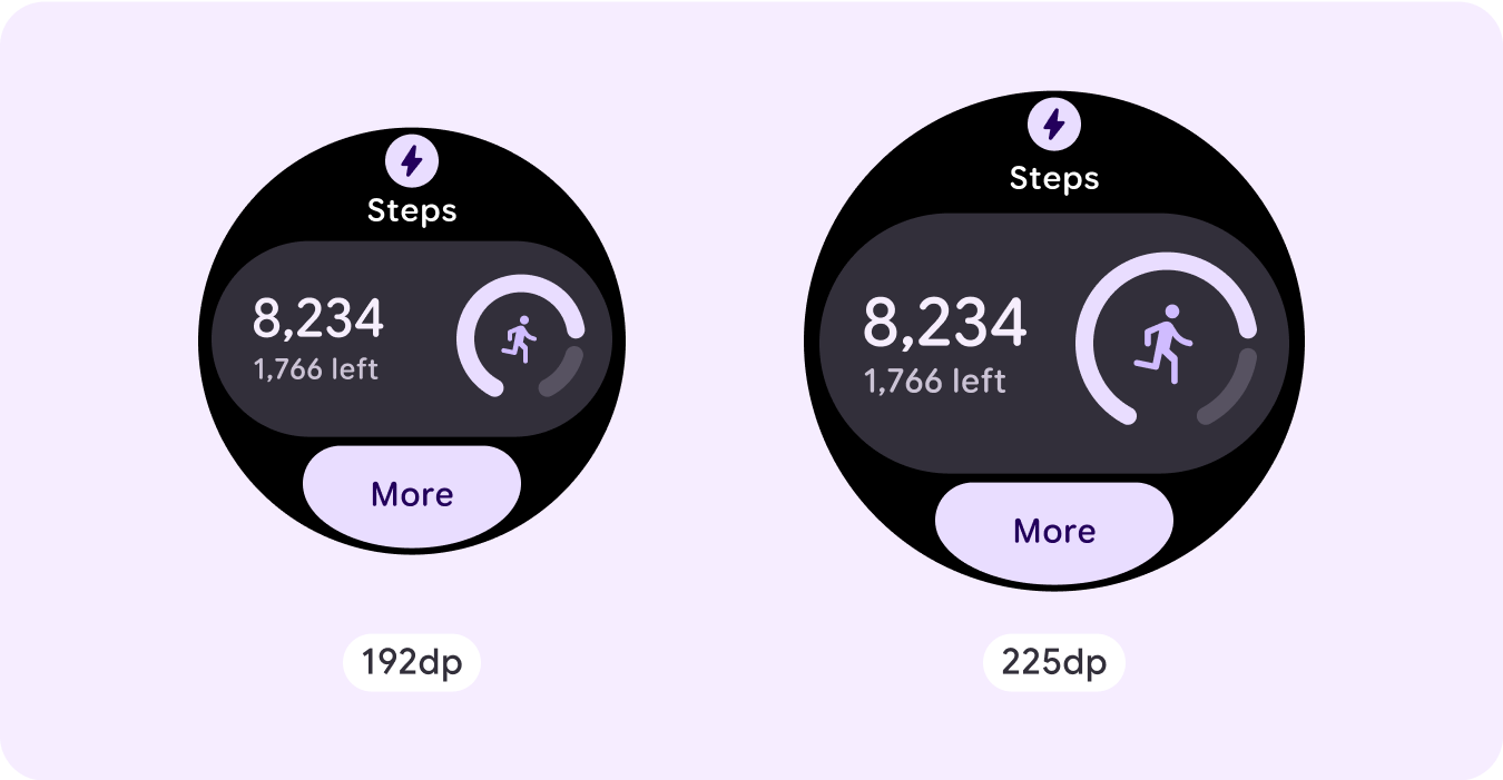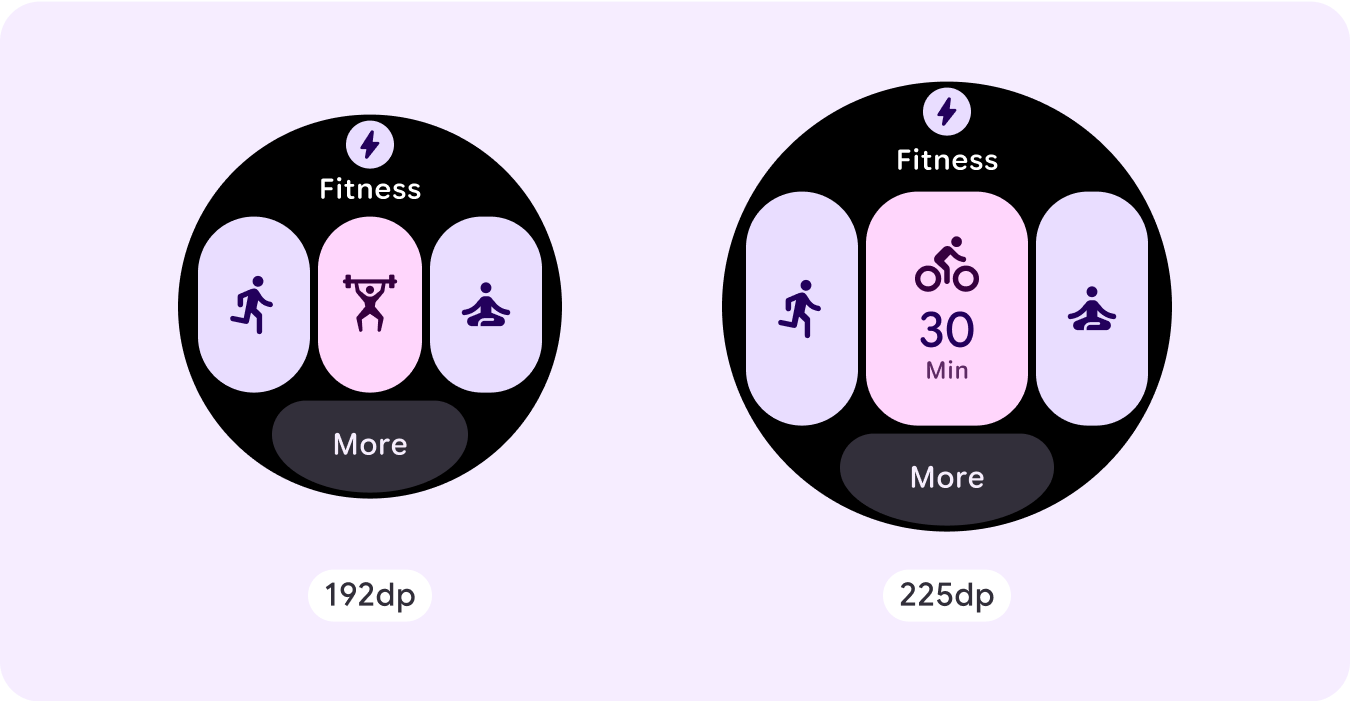 如果您使用的是我们的 ProtoLayout 模板,则可以通过 Wear ProtoLayout Jetpack 库的最新 Beta 版自动继承这些更新。此外,您只需提供在屏幕尺寸断点后添加了其他内容或组件的布局。如需有关如何充分利用更大屏幕尺寸的完整指南和建议,请参阅我们的 [功能块指南][2]。功能块的屏幕高度是固定的,因此我们调整了内边距,以最大限度地利用有限的屏幕空间,同时避免了不必要的剪裁。