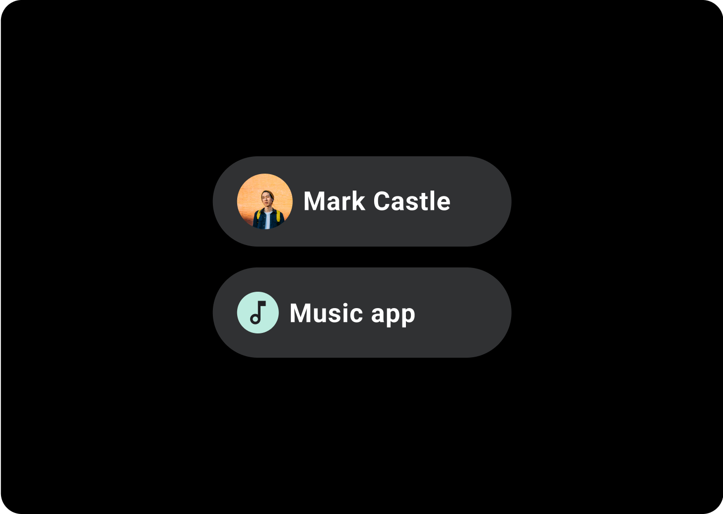 משתמשים בצ'יפים של דמויות לפעולות שקשורות לדמות שנבחרה. אפשר גם להוסיף צ'יפים של סמלי דמויות כדי לזהות את הדמות בקלות רבה יותר, כמו תמונה של תעודת מזהים של איש הקשר. סמלי הדמויות הם בגודל 32x32 dp.