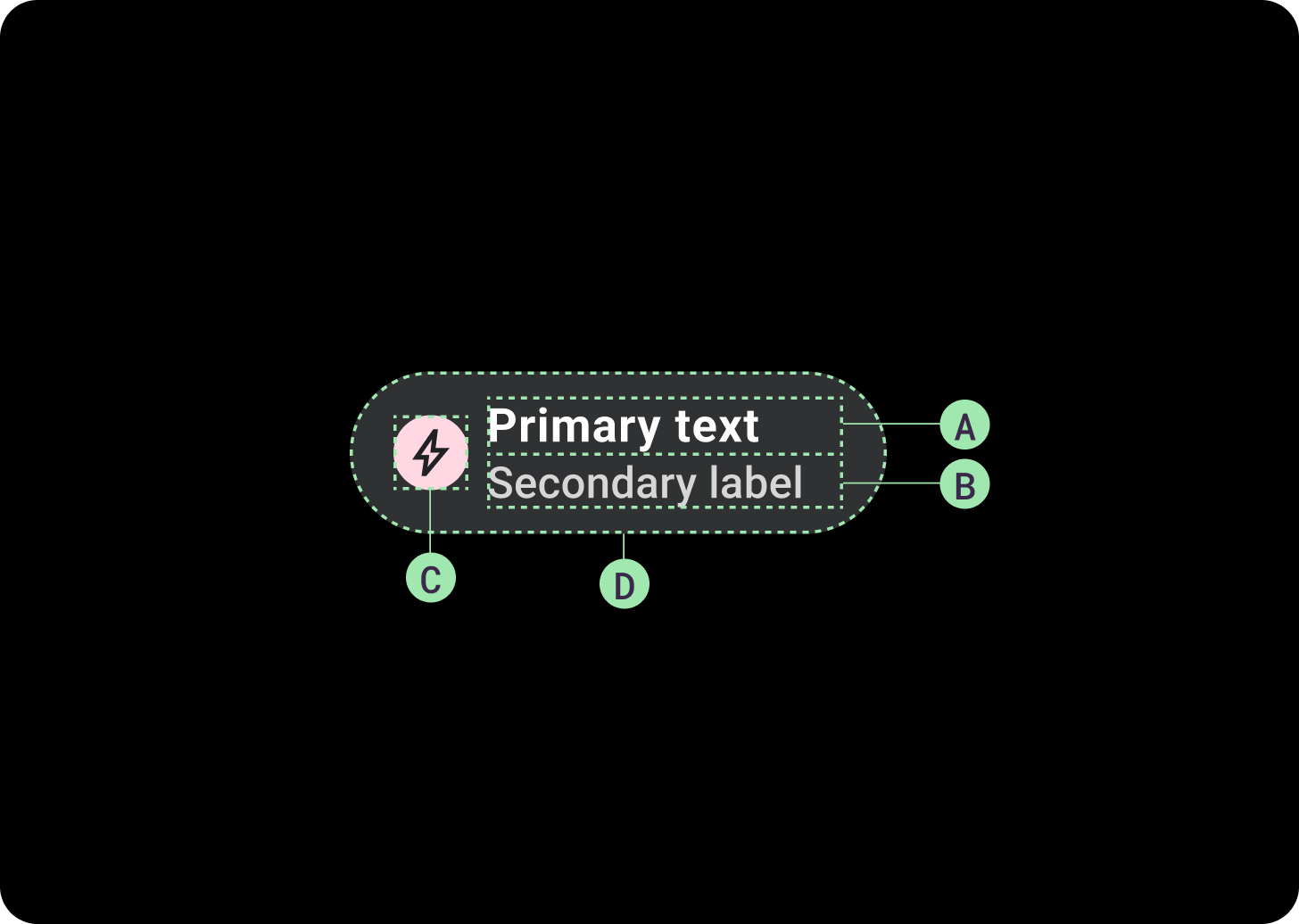 צ'יפים יכולים להכיל עד שתי תוויות טקסט וסמל אופציונלי. צריך לספק לפחות תווית טקסט או סמל אחד. אם תווית הטקסט ארוכה מדי, הטקסט עשוי להיחתך בצ'יפים. התווית הראשית היא שורת טקסט אחת אם התווית המשנית קיימת. התווית הראשית יכולה להכיל שתי שורות טקסט אם התווית המשנית לא מופיעה.